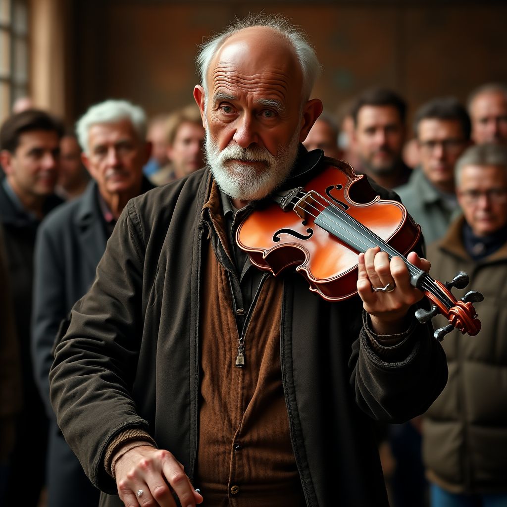 Старик внимательно смотрел на скрипку, будто видел в ней что-то большее, чем могли заметить остальные. Он сделал шаг вперёд, его сердце забилось быстрее от волнения. «Разрешите мне попробовать», — тихо произнёс он дрожащим голосом.