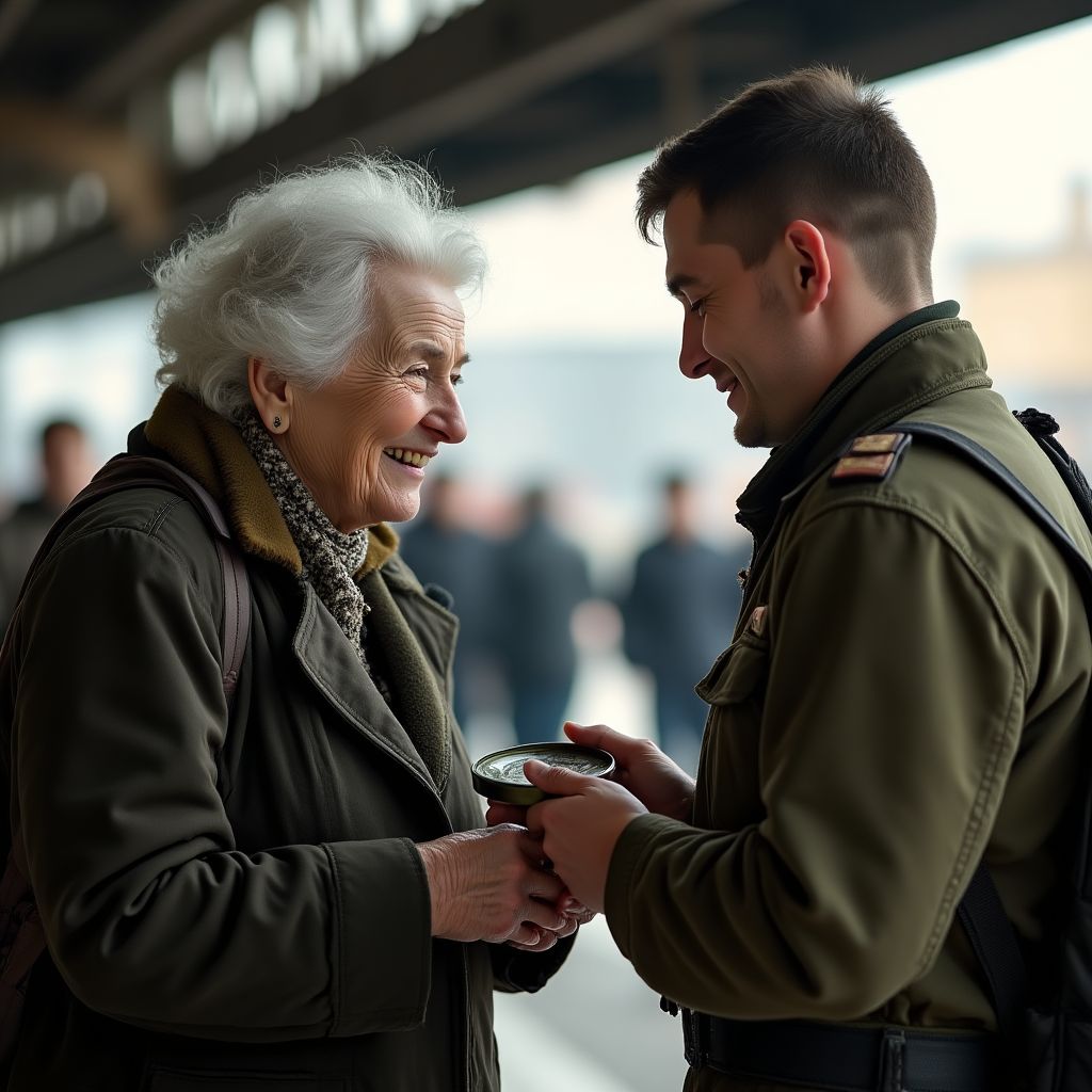 На вокзале царила суета, сливаясь в одно сплошное жужжание голосов, звуки шагов и запахи — смесь свежесваренного кофе и выхлопных газов. Летний вечер был на исходе, и с заходом солнца воздух наполнился прохладой, но атмосфера вокруг была горячей от эмоций. В дальнем углу зала ожидания стояла женщина средних лет — её глаза блестели от слёз, но взгляд был полон решимости. Она держала за руку молодого парня в военной форме. Его лицо казалось сосредоточенным и серьёзным, но лёгкая дрожь в руках выдавалась его внутреннее волнение.