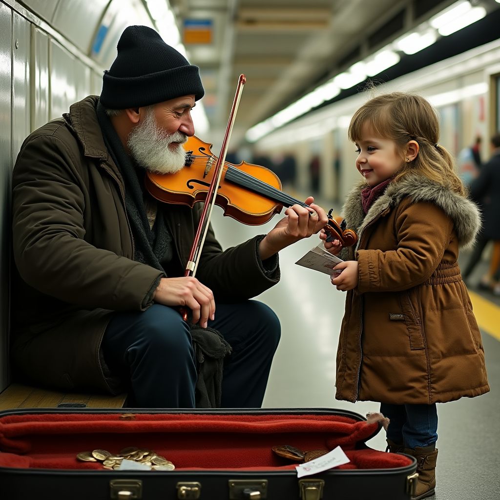 Вдруг к нему подошла маленькая девочка. Её платье было ярким пятном на фоне серости перехода. Девочка остановилась перед музыкантом и сказала тихо: «Папа, мама просила передать тебе это письмо». Мужчина застыл, словно не веря своим ушам.