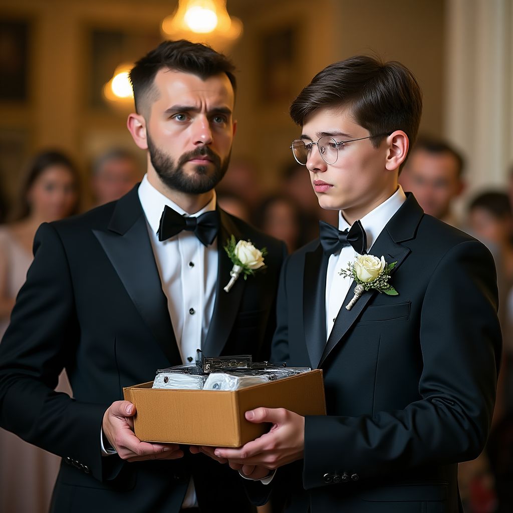 Но вместо неё в зал вошёл её младший брат — худощавый подросток с беспокойным выражением лица. Его карие глаза были полны смятения. «Макс», — начал он дрожащим голосом, протягивая коробочку с видеокассетой, — «это тебе». В зале повисла тишина, нарушаемая лишь шорохом одежды и редкими вздохами гостей.