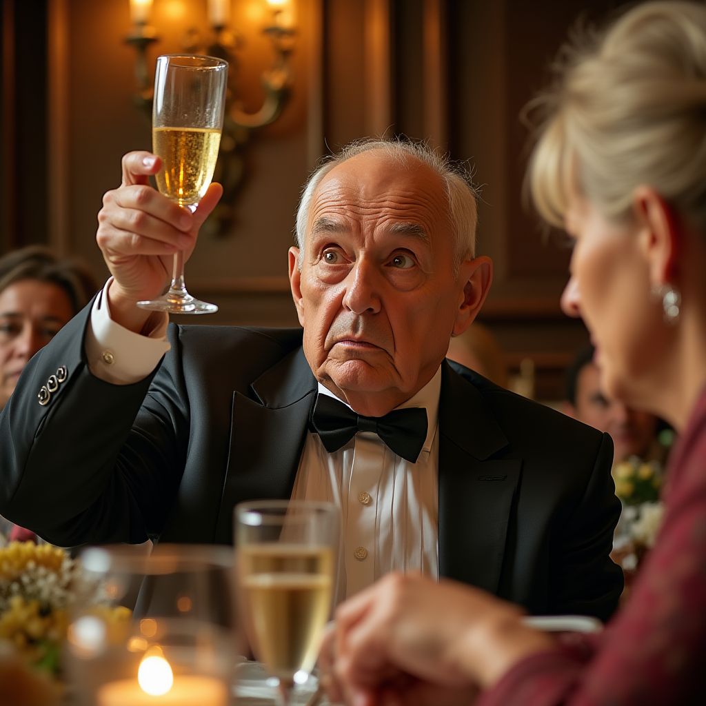 Время будто замедлилось, когда дедушка встал со своего места. «Дорогие гости,» — начал он, голос его дрожал от волнения, — «хочу поднять этот бокал не за себя или свою супругу…» Шёпот пронёсся по залу. Люди переглядывались, недоумевая.