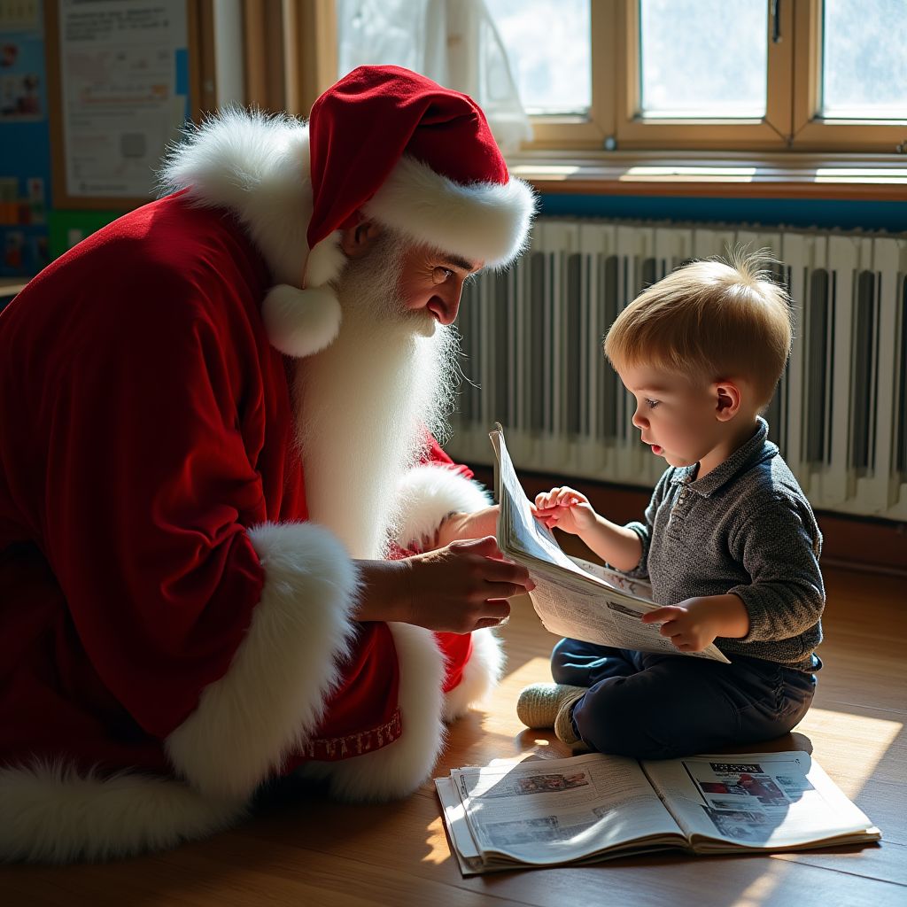 Зал детского сада был наполнен пахучим запахом мандаринов и дешевым мишурным блеском, который отбрасывал желтоватый свет на детские лица. За окном зимний ветер гнал грязный снег вдоль окна, скрипело старое отопление, и по деревянному полу слышались шорохи маленьких туфелек. Музыка из динамика казалась далёкой, как будто из другой жизни, и тёплый халат Деда Мороза немного пах табаком и усталостью, создавая странный контраст с детской радостью. Свет рампы высвечивал маленькие ладони, носы и румянец, а в углу, у входа, висела газета — намятая, со свежим пятном чая.