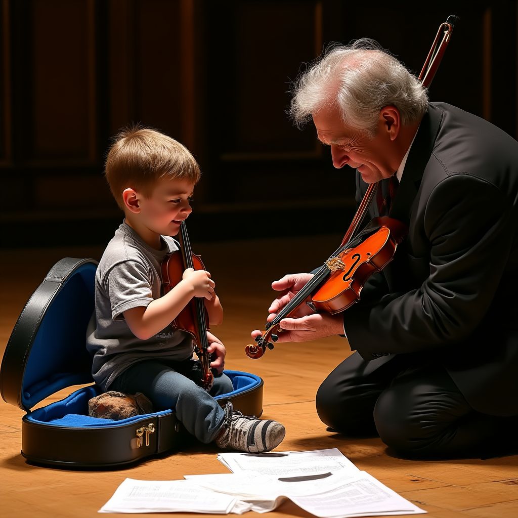 Он казался меньше, чем был на самом деле: худенький мальчик с обтянутыми щеками, волосы свисали на лоб, глаза большие и испуганные, пальцы тонкие, как спички. Его пальто было старое, воротник потертый, ботинки залатаны латками: видный знак, что его семья живёт иначе, чем остальные участники. Он держал в руках футляр, в котором скрипка звенела пустотой — струны были изношены, смычок стёрт, смола липла к ладоням. «Мама всё ещё на рынке», — шептал он себе, ощущая, как сердце бьётся громче; мысль о том, что завтра ей придется отдать смену, чтобы оплатить мелочи, сжимала горло.