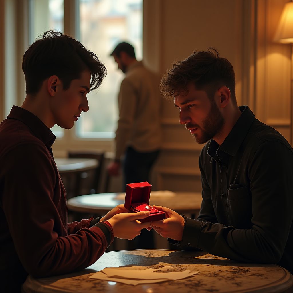 Когда официант подошёл, голос его дрожал: «Как вам вино, сэр?» — спросил он. «Всё… отлично», — выдохнул парень, отвечая слишком быстро. За столиком напротив она смотрела на него не так, как обычно: глаза холоднее, губы сжатыми линиями. Он встал, стул поскрипел, и руки его были готовы раскрыть коробочку, как заветную карту. «Аня, выйдешь за меня?» — слова сорвались, тон голосов наполнился желанием и страхом.