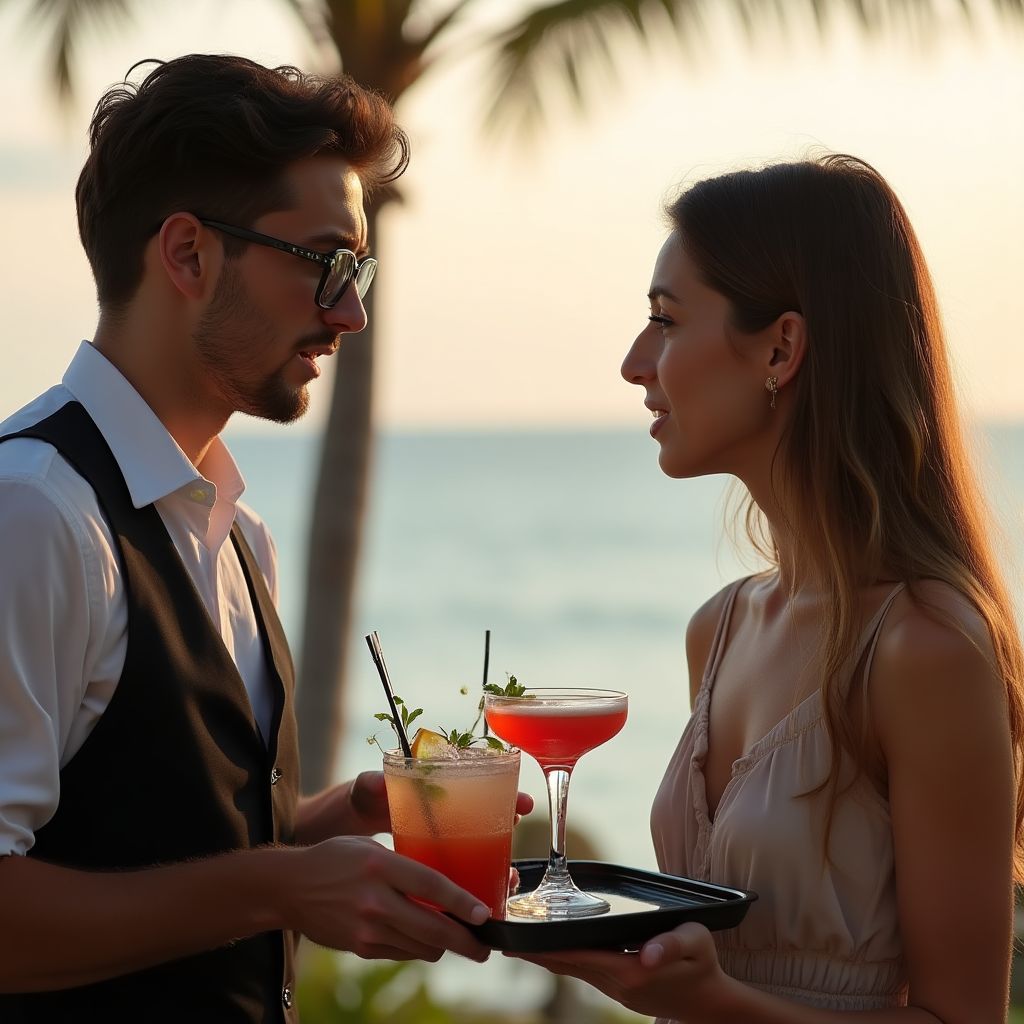 Он стоял в белой рубашке, с официантским подносом, высокий, плечи чуть сутулые от долгих смен, глаза тёмно‑карие, будто уставшие от чужих праздников. Его фамилия была на бейджике, но он знал, что по ту сторону белой формы — человек из другого мира: карманы заляпаны, руки грубые от работы, в кармане старый ключ, который он никогда не показывал. Вежливость была его броней: «Добрый вечер, можно вам что‑нибудь подать?» — так он встречал счастье чужих столов.