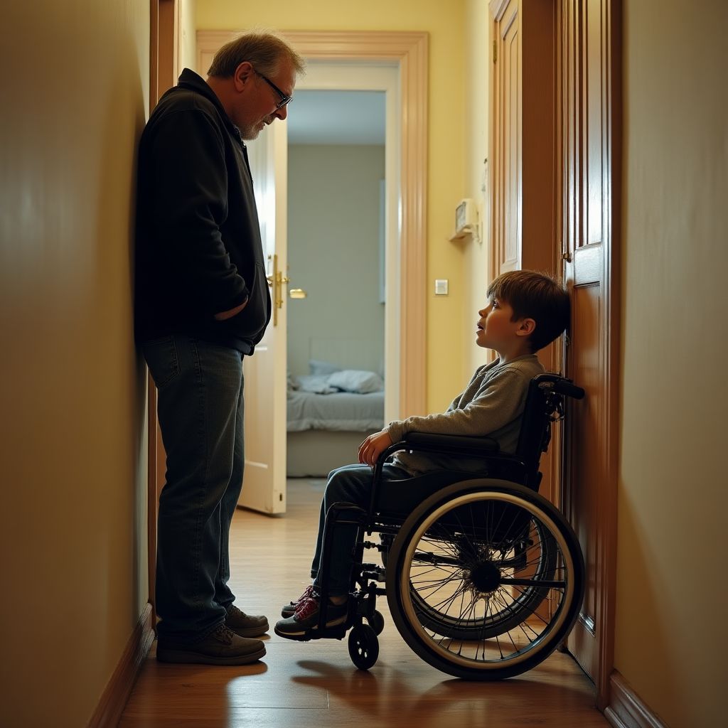 Нажал на звонок и услышал глухой стук с другой стороны двери. «Кто там?» — прозвучал голос, высокий и с детской ноткой. Дверь приоткрылась, и в проёме появился мальчик в инвалидной коляске, худой, в свободной футболке, с большими глазами, в которых жил старый пепел усталости и странная уверенность. «Здравствуйте», — сказал он тихо. «Вы разве не слышите?» — я едва сдержал раздражение. «Да, слышим», — ответил мальчик и улыбнулся так, что улыбка казалась вызовом. «Но это не моё, я просто пришёл за лекарствами», — добавил он, указывая на пакет из аптеки. Я вдавил плечами: «Тогда почему у вас музыка такая, что внизу люди не могут спать?» — «А вы не пытались зайти?» — удивлённо переспросил он.