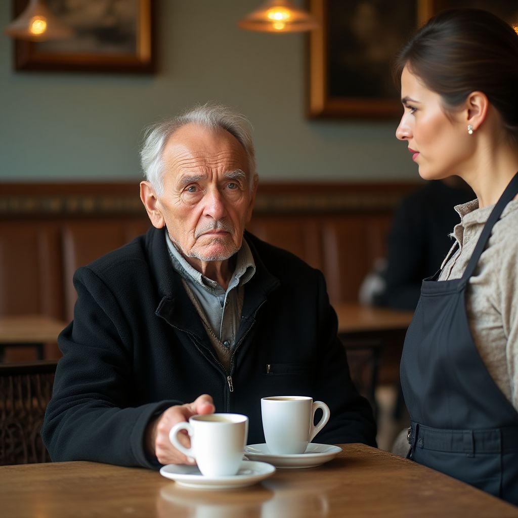 Мыслей у него было много, но он говорил мало; он казался человеком, который разговаривает с воспоминаниями. «Две чашки — одна для меня, одна для…» — он часто только начинал фразу и молчал, улыбка играла уголками губ. Внутри него жила привычка, возможно — наказанное обещание, возможно — память; он приходил сюда ради рутины, ради тепла чашки, ради того, чтобы быть рядом с кем-то невидимым. Каждое утро он ставил вторую чашку напротив пустого стула, как будто невидимая рука отвечала ему теплом; у него было своё место в мире, тихая сцена, где он играл свою роль.
