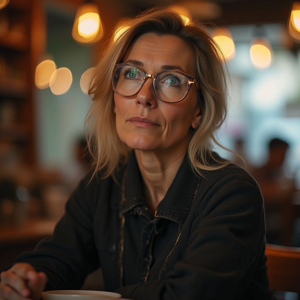 Она сидела у окна, согнувшись в пальто, которое пережило не одну зиму — локти потёрты, воротник потерял форму. Её глаза — тёмные и усталые — выдавали ночи без сна и долгие очереди в поликлинике; руки были загрубевшими от работы, ногти коротко обрезаны. Ростом она была ниже среднего, с наклонённой осанкой, как у тех, кто всю жизнь подстраивается под тяжесть обстоятельств. На её лице застыла осторожная надежда: она пришла, чтобы забыться чашкой кофе и, может быть, увидеть знакомое лицо, которое помнила по детским снам.