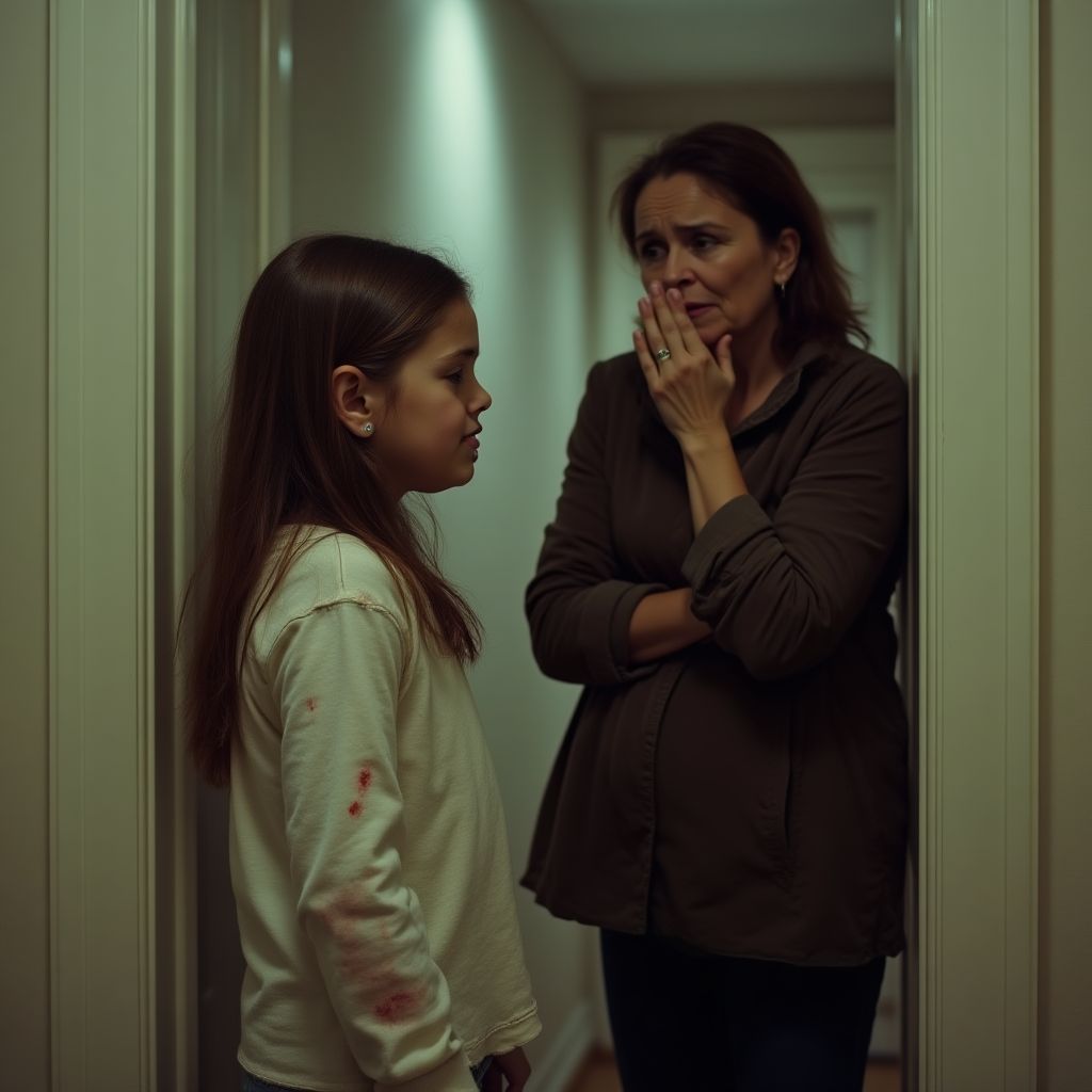 Она стояла в прихожей, держа в руке запечатанный конверт, и мир вокруг как будто растянулся: тиканье старого будильника, шорох пакетов с овощами, далёкий стук трамвая — всё это отступало, оставляя на переднем плане только запах ее чая и липкую влажность бумаги в пальцах. Дочь, сидящая на табуретке, сжимала колени, из которых слегка стекала кровь; свет лампы бросал на её лицо тени, подчеркивая синяки и слёзы, которые она не могла остановить. «Почему ты не сказала?» — проговорила она, но голос её был вязкий от накопленной усталости, и плач дочери ответил больше, чем могли бы слова: «Я боялась, мам…».