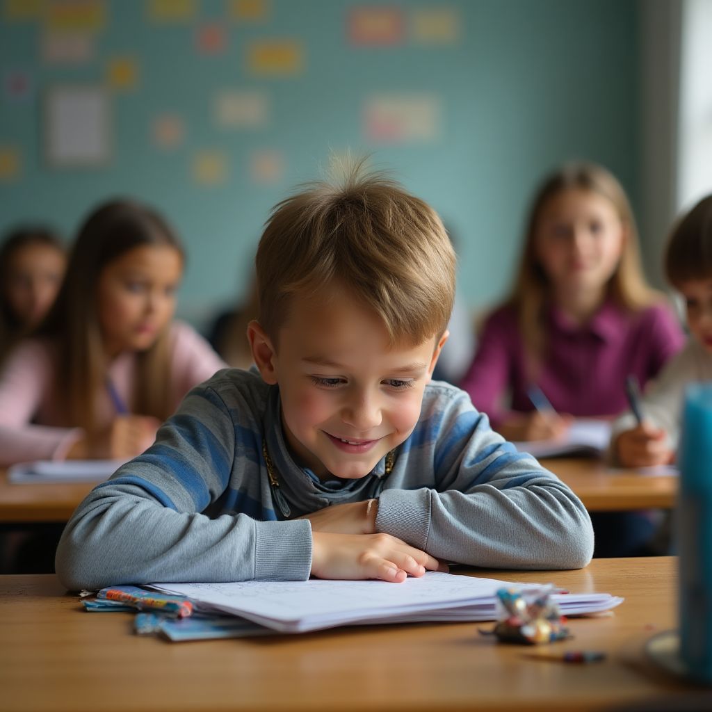 В углу класса, невидимый почти для всех, маленький мальчик — худенький, с загревшимися щеками и испачканными коленками джинс. Его светло-русые волосы чуть торчали и слегка беспорядочно спадали на лоб. Он выглядел как ребенок с обложки журнала «бедность и невинность» — в старой куртке, которая была на пару размеров больше, и с изношенными кедами, скользил молча по классу. Его глаза — большие голубые, с тенью тревоги и волнительного ожидания, — следили за каждым движением учителя. Он был шатким и незаметным в этом мире взрослых, но внутри горело что-то дерзкое и смелое. Сегодня он пришёл сюда не просто так — у него была важная миссия. Прятаться в сумке учителя было безумием, но надежда горела ярко.