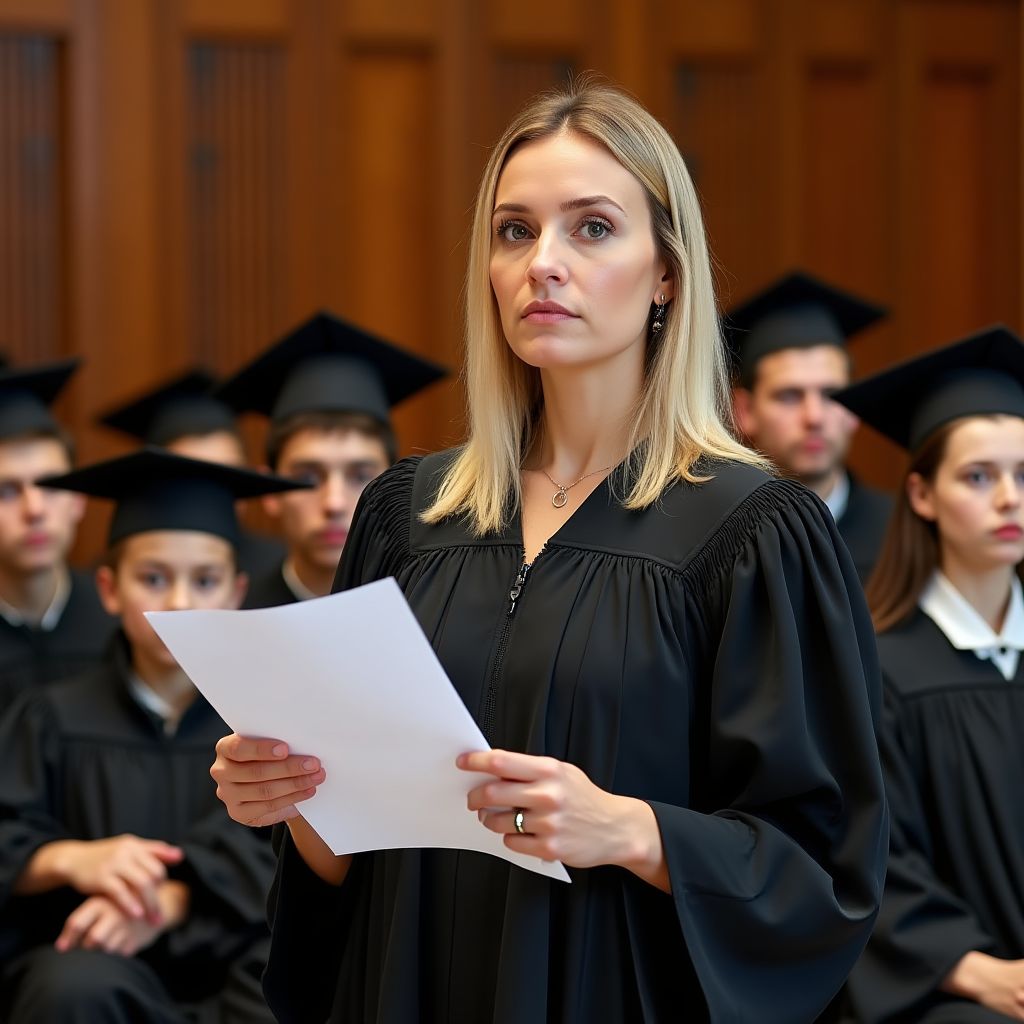 Вокруг повисла тяжелая тишина, прерываемая лишь приглушёнными шёпотами и учащённым дыханием некоторых выпускников.