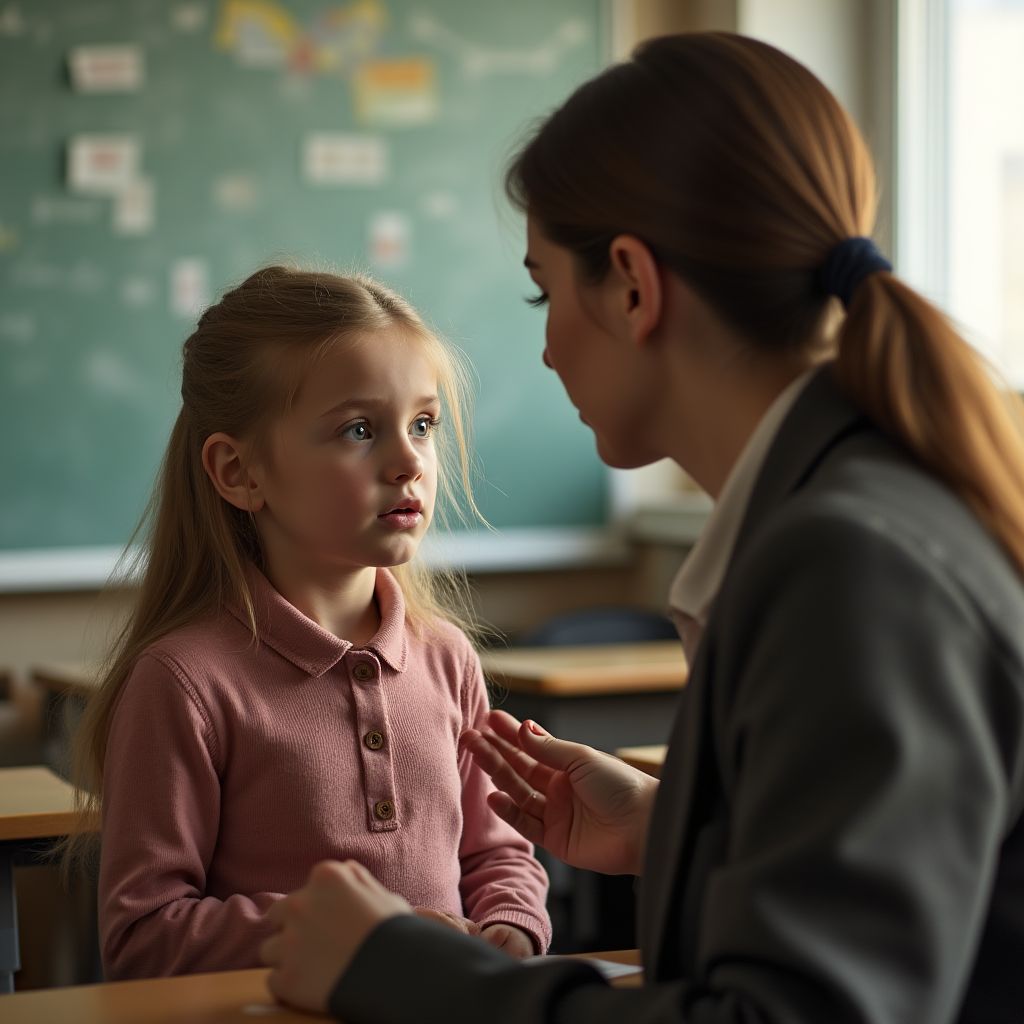 — Почему ты опоздала? — голос учительницы был ровным, но с лёгким дрожанием. «Ты ведь обещала прийти вовремя», — продолжила она, заставляя девочку опустить глаза.
