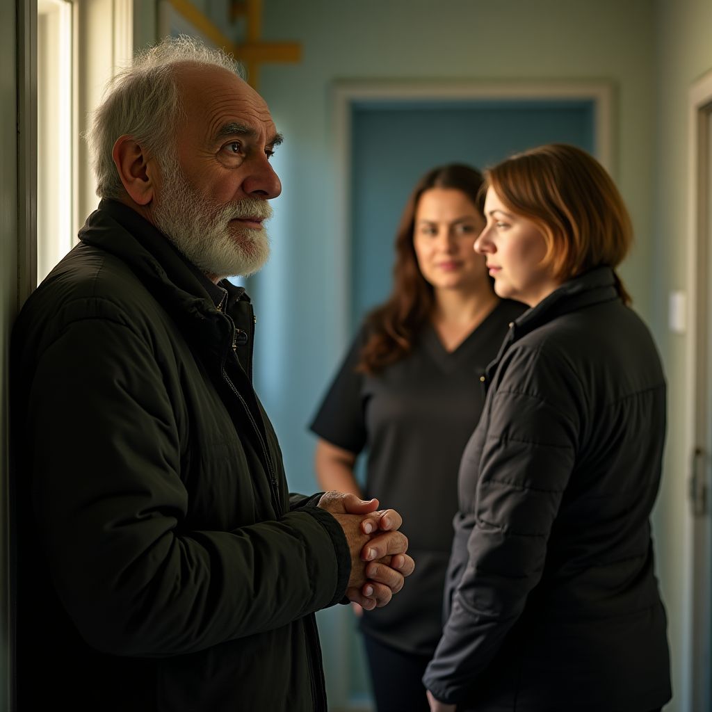 Мужчина почувствовал, как ком из обиды и боли сдавливает грудь. Руки сжались в кулаки, сердце билось учащённо, дыхание сбивалось. Был он просто ещё одним бездомным для этих людей или скрывалось в нём нечто большее? Эти мысли не отпускали, пока его взгляд не упал на одинокую старушку в другом конце зала, глаза которой вдруг наполнились слезами. Что-то внутри него дрогнуло.