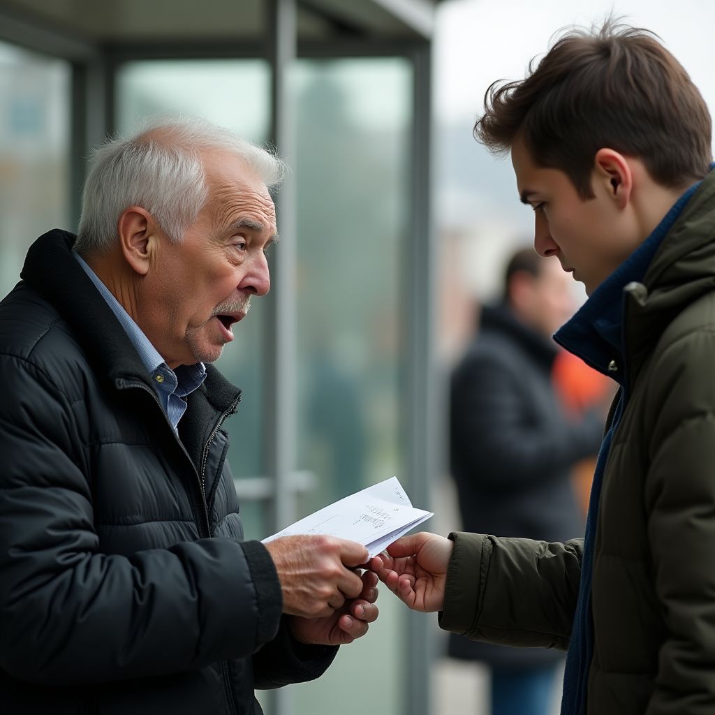 «Кто он? Зачем именно ему?» — слышалось неуверенное бормотание от прохожих. «Может, это помощь?» — пробормотала женщина с сумкой, поглядывая на конверт. Рабочие неподалёку, одетые в грязные куртки и каски, переглянулись, проявляя заметное недовольство и удивление. «Впервые вижу, чтобы кто-то старый столько стоял на этой остановке, привыкли здесь видеть молодых», — сказал один из них, притягивая курительную трубку к губам. В воздухе повисло напряжение; кто-то даже усмехнулся с вызовом, а старик ощущал, как капли дождя смешиваются с мурашками по коже.