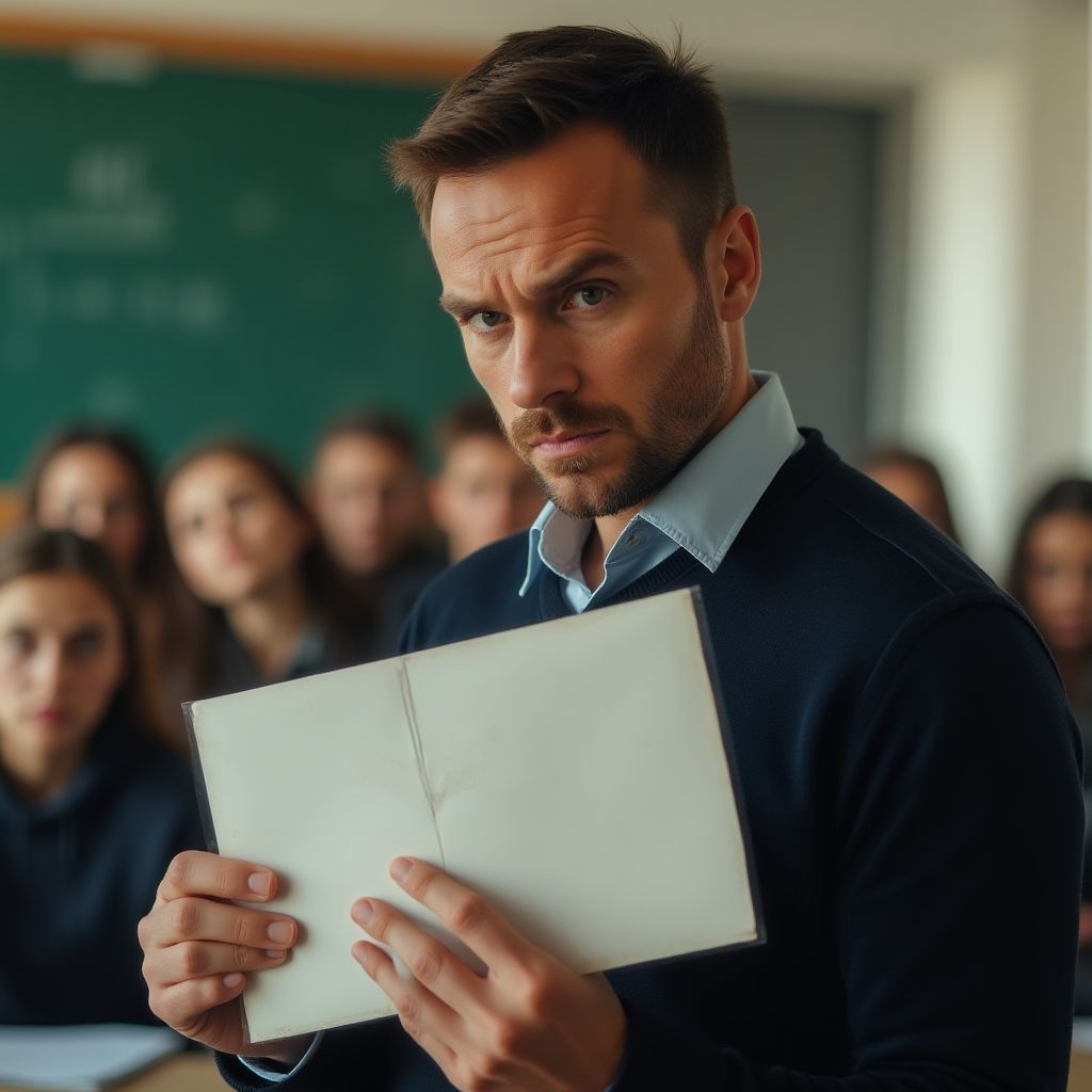 В класс вошёл учитель средней руки лет сорока пяти — высокий, с усталым, но строгим взглядом, в простом тёмном костюме, не отличающемся от последних лет моды, скорее выцветшем и поношенном. В руках он держал плоский конверт, который сжимал так, что вены на руках едва не проступали. Его коротко стриженные волосы были слегка растрёпаны, а на лице играли тени усталости и беспокойства. Учитель остановился у доски, и робкая тишина, царившая в классе, внезапно стала невыносимой, словно давящим свинцовым одеялом.