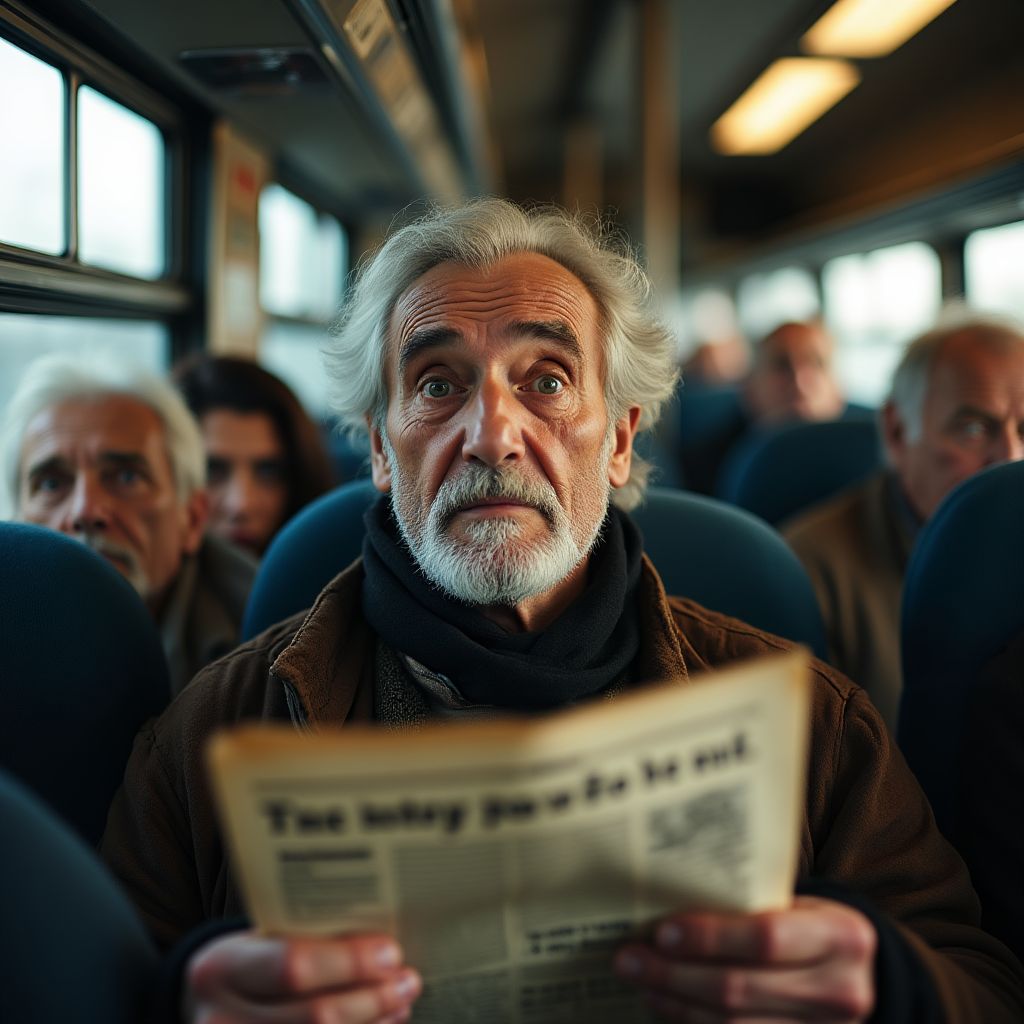 Как только мужчина, дрожа от напряжения, приготовился прочесть драматическую статью, весь автобус затаил дыхание. По лицам пассажиров скользила смесь любопытства и тревоги. Тихий шум улицы словно затих, а свет ламп казался холоднее, чем прежде. Взгляд бездомного скользил по строкам газеты, в сердце бушевала буря чувств — от сомнения до надежды.