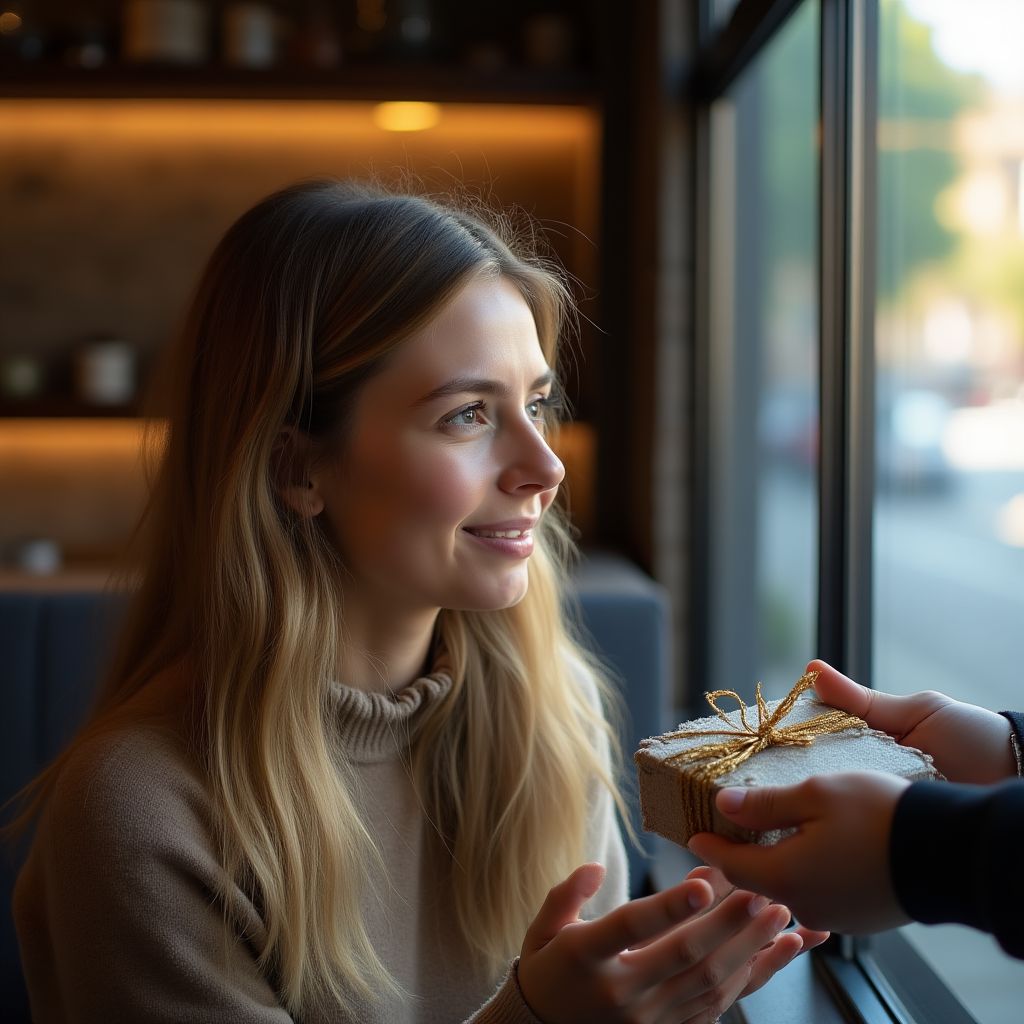 Женщина сжала подарок в ладонях, сердце её начало биться чаще, дрожь пробегала по спине. Она почувствовала, что этот момент — не просто случайная встреча, а поворот судьбы. Взгляд её скользнул по окну — за стеклом суета, движение, но здесь, в этом маленьком кафе, всё затаило дыхание.