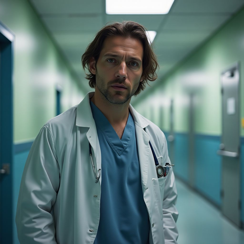 Доктор Алексей Смирнов стоял у окна смотровой, его высокий рост и строгий силуэт выделялись на фоне белых стен и монотонного света. Глубокие карие глаза отражали усталость нескольких бессонных ночей, бледное лицо освещал приглушённый свет лампы, подчеркивая кожные складки и лёгкую щетину. На нём была простая, но аккуратная врачебная куртка, слегка помятая от многократного закидывания за спину. По манере держаться и говору было понятно — человек из народа, который никогда не стремился к богатству и роскоши, привыкший жить в условиях постоянного дефицита и борьбы за справедливость. Его пальцы нервно сжимали пластиковую чашку с нектаром, пока он терпеливо ждал окончания смены.