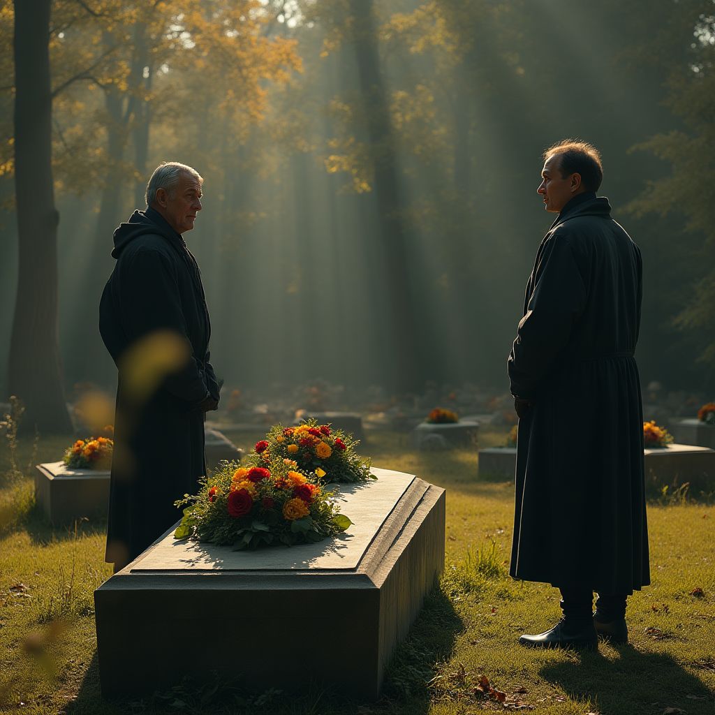 «Он такой смиренный был», — прошептала женщина в тёплом платке рядом, и другая ответила: «Не ожидала, что так быстро». «Где его семья?» — спросил кто-то издалека. «Он никому не мешал», — добавил старик, ударив по табурету дубинкой. Внезапно кто-то прошептал: «Посмотрите, там человек в чёрном плаще», — и все взгляды устремились в угол кладбища. Среди темных силуэтов их внимание приковал незнакомец: дорогой плащ, тревожно сжатые ладони, взгляд, от которого веяло виной.
