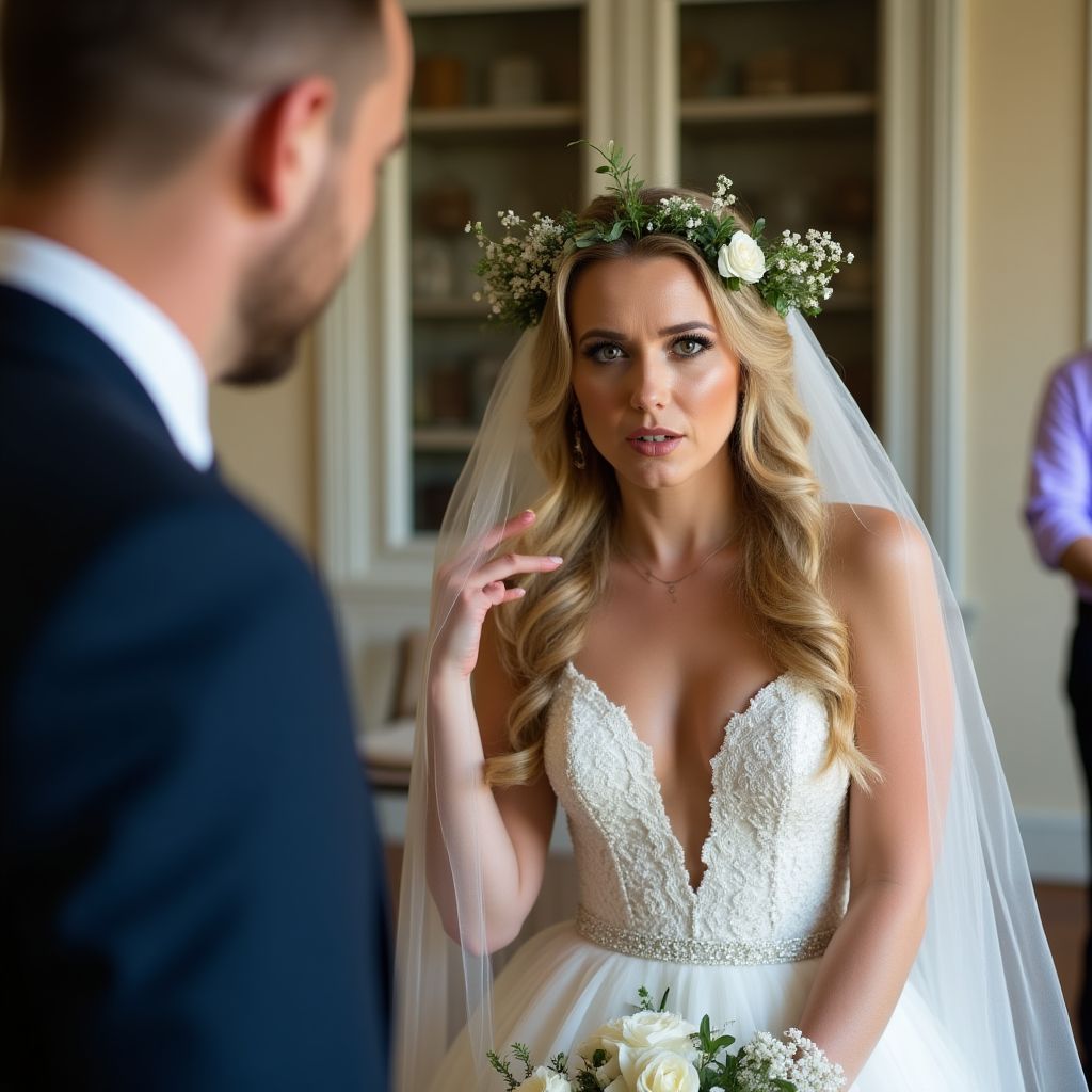 Сердце невесты билось всё сильнее, когда она отступила от жениха, глаза её сверкали слезами и решимостью. Все присутствующие, ошеломлённые и замершие, внимательно следили за каждым её движением. Жених, лицо которого исказилось гневом и недоверием, попытался произнести слово, но вместо этого услышал лишь тишину, давившую как свинцовое одеяло.