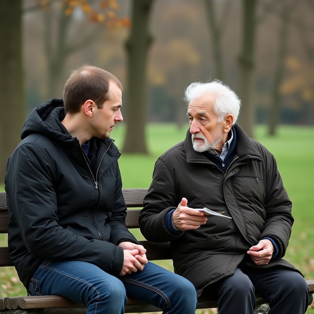 «Эй, парень, тебе помощь нужна?» — раздался тихий голос. Возле скамейки появился старик в потёртом пальто, с морщинистым лицом и усталыми, но добрыми глазами. Максим вздрогнул и чуть отступил, чувствуя себя неловко. «Я вижу — тебе нелегко. Поверь, я знаю, как это бывает», — продолжал старик, почти шепча. Взгляд Максима пронзала смесь удивления и недоверия. Старик казался простым, но в его голосе была серьёзность, которая не оставляла места сомнениям.
