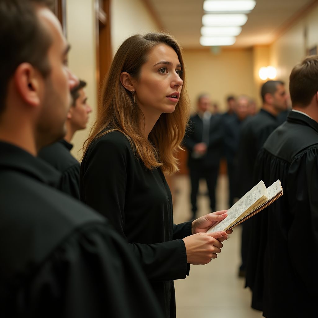«Ты не должна мешать, — ворчал охранник, заметив её у входа. — Это суд, а не место для твоих спектаклей». Девушка вздохнула, но её голос прозвучал громко, звонко и неожиданно: «Я должна рассказать то, что никто не ждал услышать. Это правда, и вы должны знать!» Вокруг раздались вздохи, взгляды устремились на неё с тревогой и непониманием. «Что дальше?..» — подумала она, ощущая пронзительный холод от внимания всех лиц, сливавшихся в единую волну напряжения.