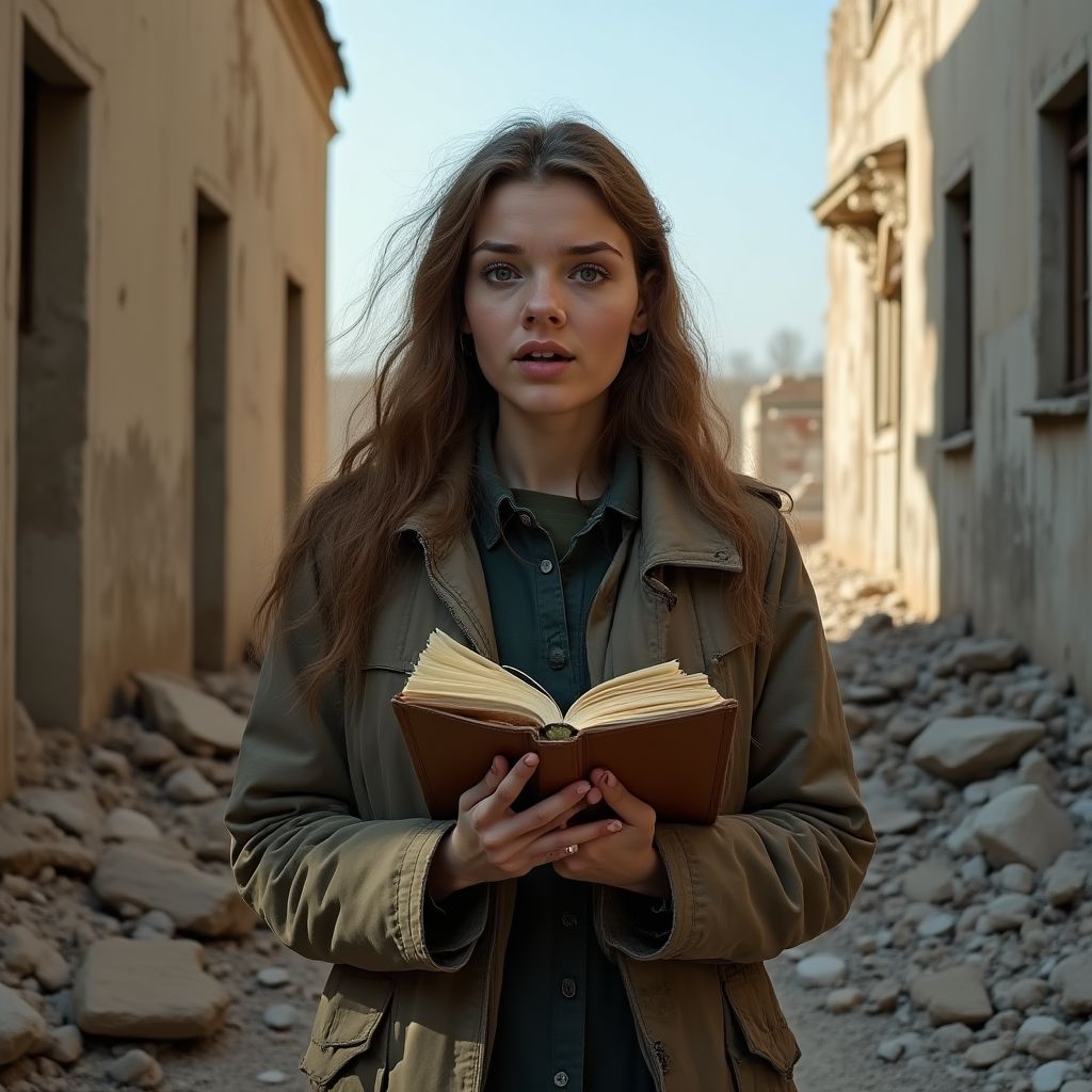 На краю этой разрухи стояла женщина средних лет, худощавая, с почти прозрачной кожей, глаза — большие и усталые — смотрели вглубь развалин. Её пальцы дрожали, сжимая оборванную кофту, которая давно потеряла былую чистоту, а на ногах — потертые туфли на низком каблуке, едва держащиеся на подошве. Рост её казался ниже среднего, но осанка — ровная, хоть и уставшая. Старые пряди волос, завязанные в небрежный хвост, выбивались из-под капюшона. Вокруг неё — пыль и обломки, в которых таилась история, которую она никак не могла отпустить.
