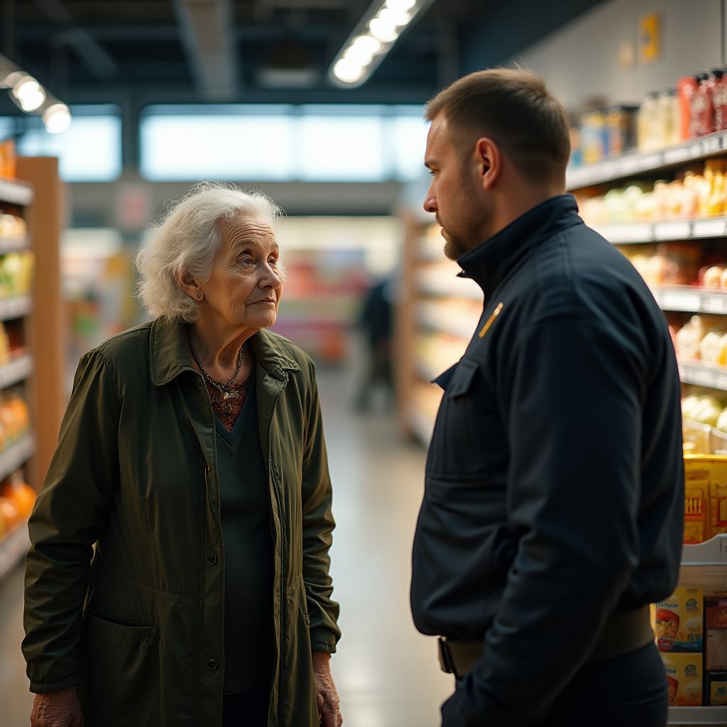В центре всех взглядов стояла пожилая женщина, едва касавшаяся пола своей старой изношенной сумкой. Её седые волосы были собраны в небрежный пучок, тускло блестящие глаза выдавали усталость и осторожность. На ней была простая пальто, слишком большого размера, по краям изношенное, будто пережившее не одну зиму. Медленные и нетвердые шаги казались странным контрастом в быстром потоке старших и молодых покупателей. Она внимательно оглядывалась, будто боится быть замеченной, и казалось, что каждое движение наполнено скрытым смыслом и страхом.