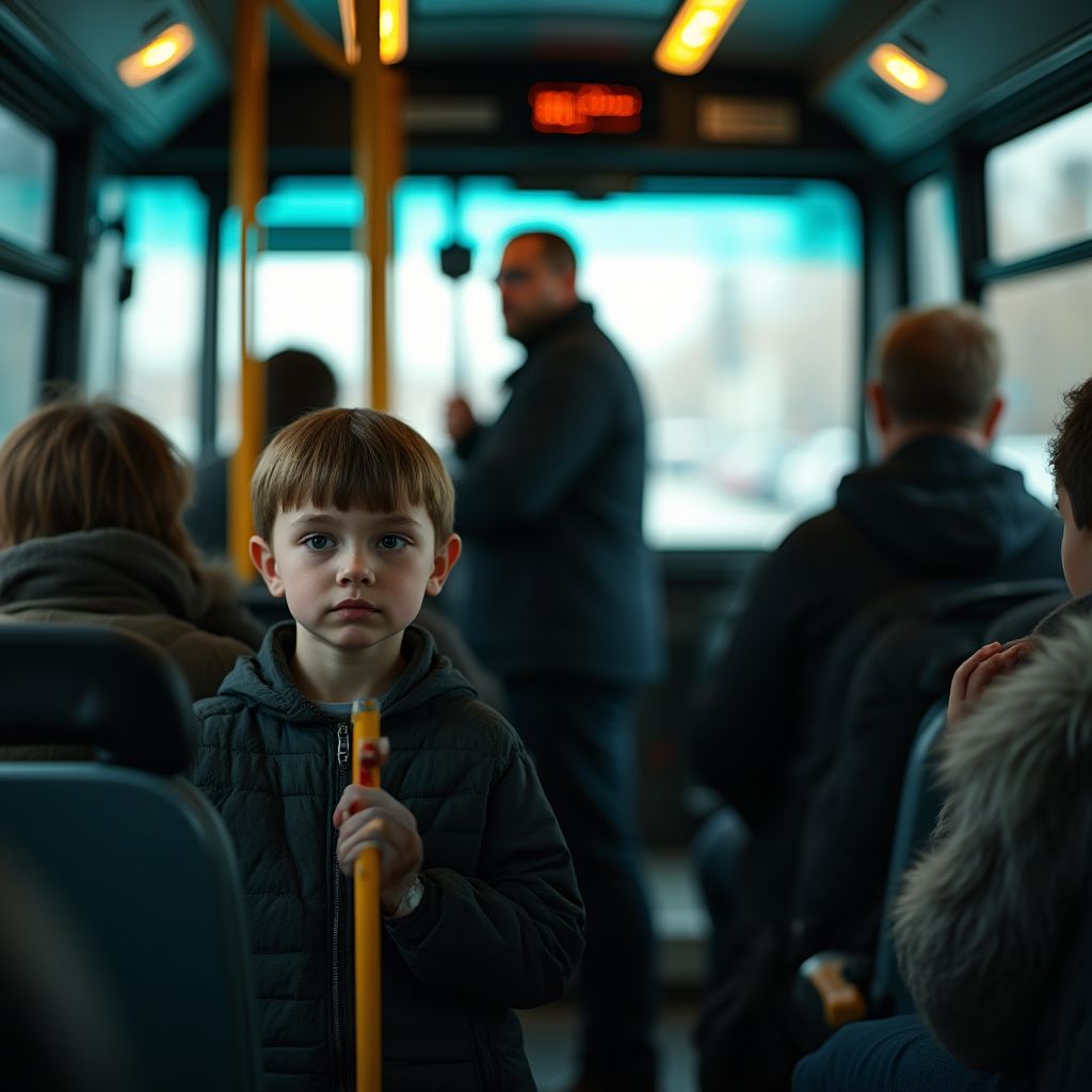 Тишина стала невыносимой, и все взгляды обратились к нему в ожидании ответа. Его сердце бешено колотилось, ладони вспотели. В этот момент, казалось, весь мир замер, и лишь от его решения зависела судьба мальчика и атмосфера в автобусе. Тишина давила тяжёлым свинцовым одеялом — никто не мог предсказать, что случится дальше…