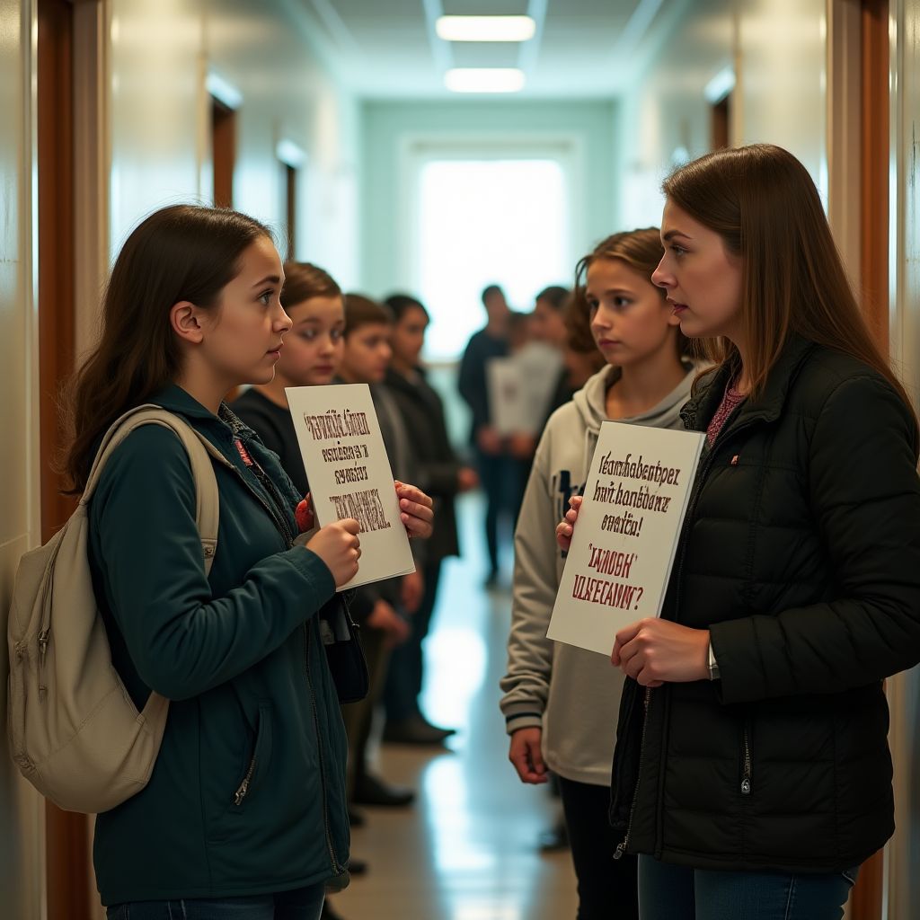В школьном коридоре стояла гнетущая тишина, прерываемая лишь эхо шагов и шёпотом нескольких ребят. Свет, льющийся из тусклых ламп над головой, отбрасывал длинные тени на стенах, где висят выцветшие плакаты с пожеланиями удачи. В воздухе витал холодный осенний запах влажной листвы, просачивающийся через приоткрытые окна. На улице мелкий дождь барабанил по асфальту, создавая ощущение замедленного времени. Именно в этот момент дети, сжимая в руках разноцветные плакаты с надписями, собрались пройти по коридору, не подозревая, что этот поход обернётся неожиданной драмой.