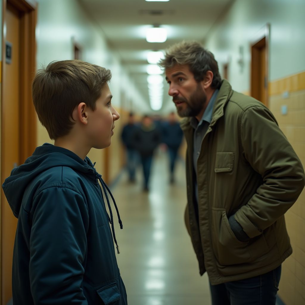 Дождь усилился, когда отец осторожно взял сына за руку и провёл его в сторону угла школы, где их уже никто не мог слышать. Учителя и другие родители остановились, ошарашенные неожиданным поворотом событий. Грязная одежда отца слишком разительно контрастировала с блестящими униформами и аккуратными костюмами. Он не скрывал своих эмоций — дрожь в руках, быстрый вдох, мутные глаза, наполненные слезами и уверенностью одновременно. В этот момент время будто остановилось, и каждый, кто наблюдал за происходящим, чувствовал давление невыносимой правды.