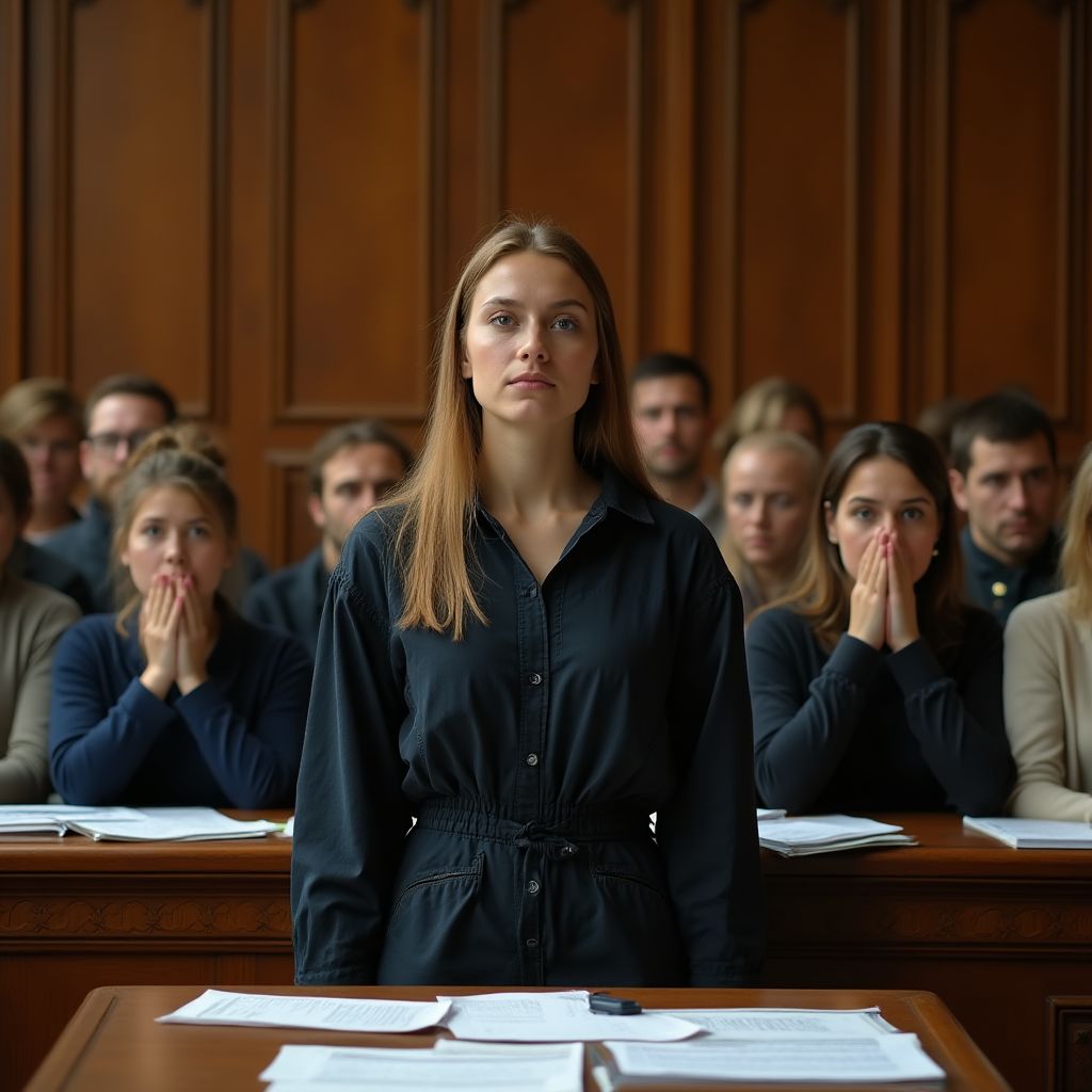 В центре этого мрачного пространства стояла юная женщина — Марина. Её худощавая фигура казалась хрупкой на фоне массивных дубовых скамеек и мраморных стен. Светло-русые волосы были собраны в небрежный пучок, из-под которого выбивались несколько прядей, придавая облику некий беспорядок. Глаза — большие, голубые, наполненные тревогой и стыдом — с беспокойством бегали по залу, где господствовала холодность и отчуждение. Белая простая блуза и поношенные джинсы явно не соответствовали парадности обстановки, отражая социальный разрыв между ней и другими участниками процесса. Она была матерью-одиночкой, простой женщиной из рабочего района, стоявшей в этом месте ради самой важной цели — спасти сына.