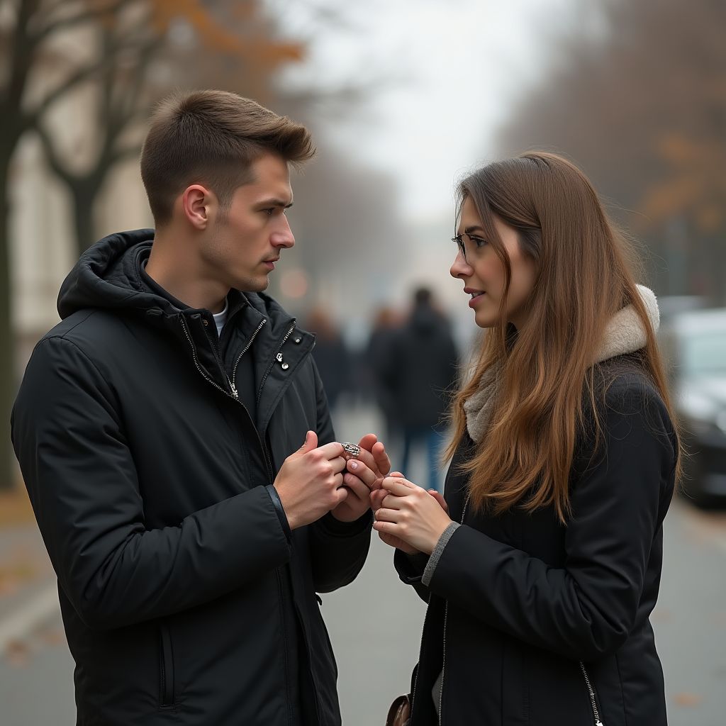 Иван стоял, почти не двигаясь на тротуаре у входа в ЗАГС. Его рост средний, но рамки его фигуры казались хрупкими в слишком потёртой кожаной куртке, которая казалась чужой среди сияющих свадебных платьев и элегантных костюмов вокруг. Тонкие губы напряжённо сжимались, а глубокие карие глаза быстро обводили пространство — видно было, что внутри его бушуют мысли, не давая покоя. Потёкшая грязь на ботинках и слегка потертый рюкзак выдавало скромный, даже скованный статус. Он не похож был на типичного молодожёна — его плечи наклонены от усталости и тяжести неизвестной ему самим тайны.