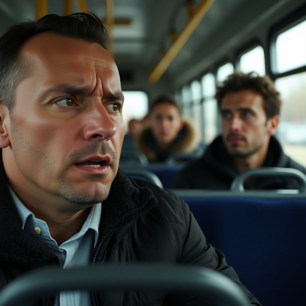 — «Садись на своё место,» — прохрипел водитель, заметив напряжённость. — «Или я вызову полицию.» — Его голос звучал холодно, без тени сочувствия.