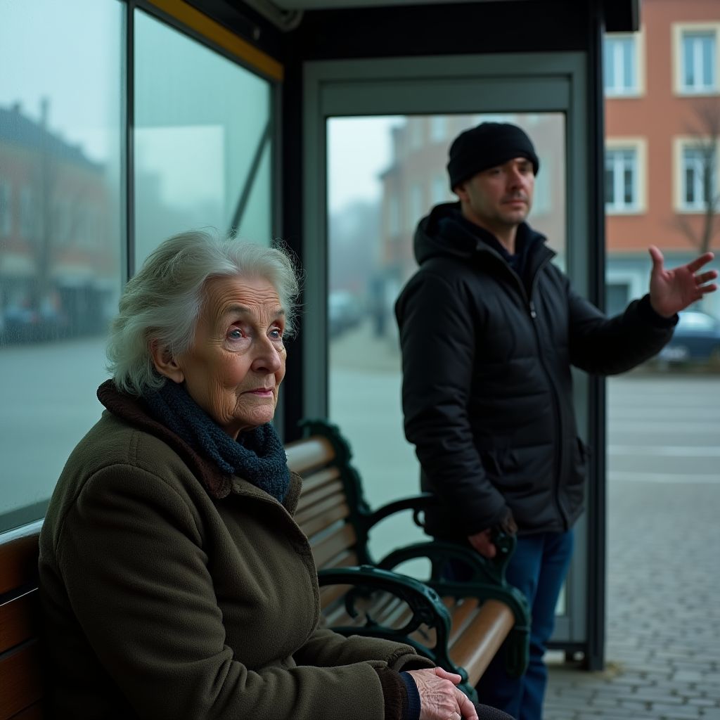 Другие пассажиры начали перешёптываться, пытаясь понять смысл происходящего. «Она, наверное, одна из тех, кто всегда в стороне и никому не нужен», — шептала пожилая женщина у ларька, смахивая слезу. «Не вздумай слушать его! Это опасно!» — воскликнула прохожая женщина с коляской. «А может, он действительно хочет помочь? Может, всё иначе, чем кажется?» — тихо проговорил молодой парень, глядя на незнакомца с сомнением. В воздухе повисло противоречие, напряжение росло, а сердца старушки били всё быстрее, словно предчувствуя судьбоносный поворот.