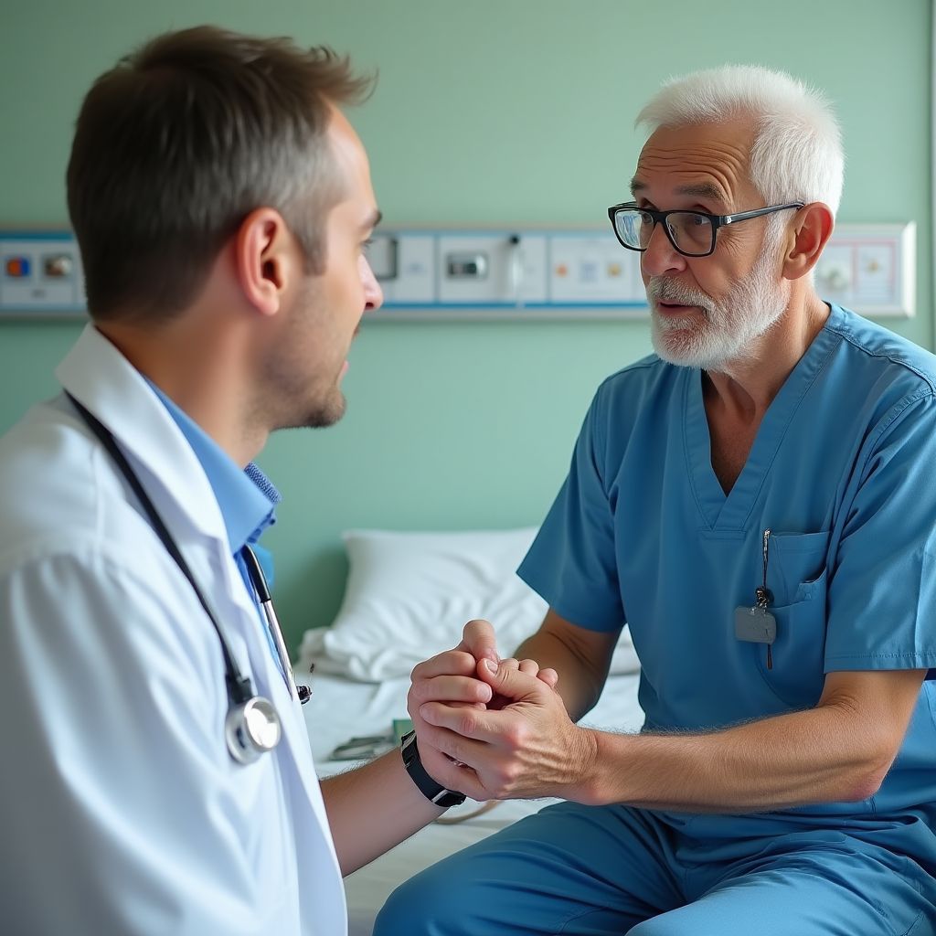 В палату вошёл врач — молодой мужчина с усталым взглядом и строгой осанкой. Его белый халат был аккуратен, но глаза выдавали бессонные ночи и тяжесть ответственности. Он подошёл к кровати, сжал в своей ладони руку старика и тихо спросил: «Как вы себя чувствуете, Иван Иванович?». В ответ прозвучал тихий вздох, смешанный с отчаянием. Другой пациент зашептал: «Опять эти боли… никто уже и не слушает нас…».