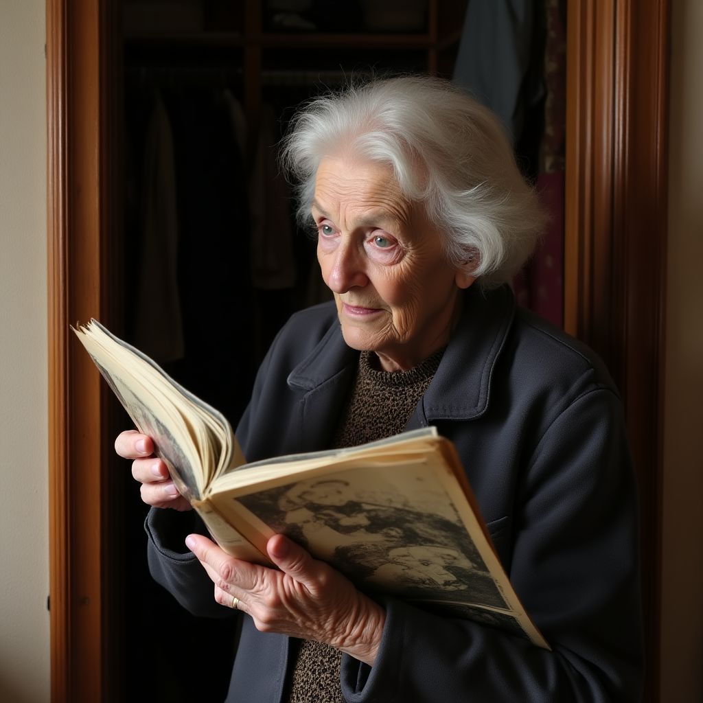 Анна Петровна, пожилая женщина с морщинистым лицом и усталыми серыми глазами, медленно приблизилась к металлическому шкафу, покрытому слоем пыли и паутины. Её руки, дрожащие от холода и времени, тянулись за забытым альбомом, который, казалось, хранил в себе целую жизнь. Её одежда — простое изношенное пальто и разношитые ботинки — свидетельствовали о тяжёлой доле и скромном положении. Она была всего лишь уборщицей в этом доме, невидимой для большинства, но сейчас её сердце забилось сильнее обычного.