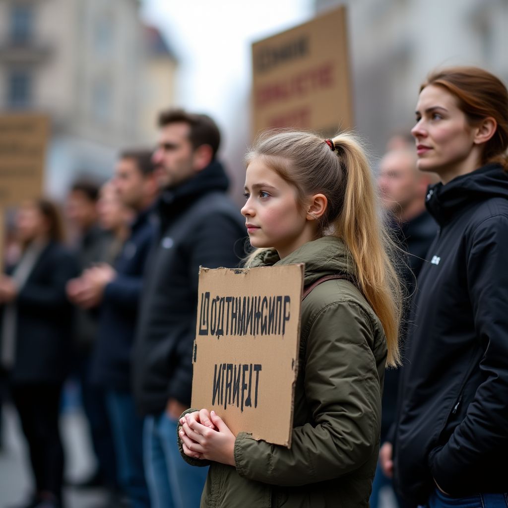 Она стояла в очереди, держа в руках простенький плакат с надписью, написанной неровным детским почерком. Неловкая, скромная девочка с опущенными глазами и нерешительной улыбкой была словно тень на фоне шумящих людей. Её тонкое пальто было слишком большим и ветхим, тусклые глаза искали поддержки в мелькании прохожих. Казалось, она неуместна здесь — безмолвная, почти незаметная, на грани исчезновения среди суеты и пренебрежения.