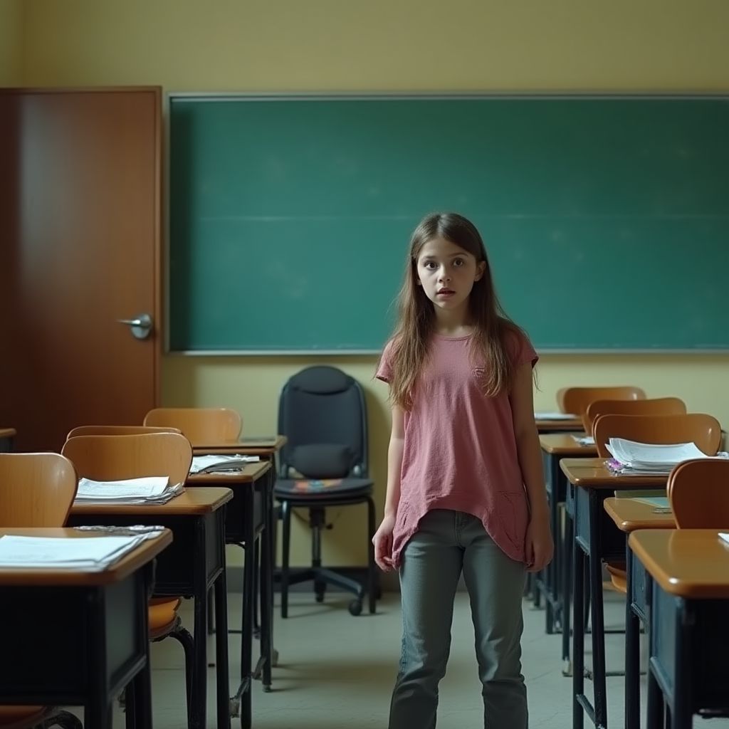 Думы тревожили её, сердце колотилось чаще с каждым шагом. Сегодня утром, спеша на уроки, она забыла свою тетрадь по литературе — единственную опору для контрольной работы завтра. Вернувшись, она отчаянно надеялась увидеть её на парте. Но нечто на столе заставило ее замереть. «Что здесь происходит?» — думала она, ощущая, как холодный пот покрывает лоб. Внутри разгоралось чувство, похожее на приближающуюся бурю.