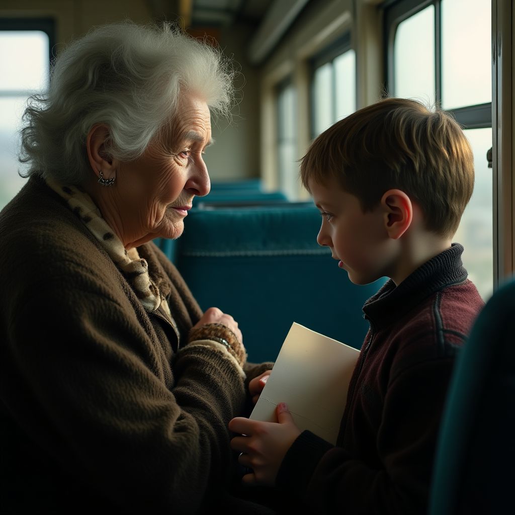 На соседнем сидении сидел мальчик лет десяти. Его глаза, большие и заметно усталые, смотрели в окно, отражая мир, куда он явно не принадлежал. Неброская одежда: поношенный серый свитер и мешковатые брюки — разбросанные слои бедности и забытых обещаний. Его кожа была бледна от усталости, а руки — тонкими и такими хрупкими, будто могли сломаться при малейшем прикосновении. Он обернулся, затаив дыхание, когда в дверях появилась хрупкая старушка — её глаза озарялись каким-то загадочным светом, а дрожащие руки крепко сжимали пожелтевший конверт.