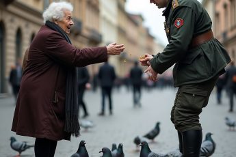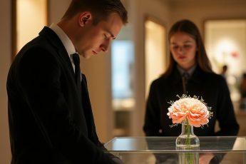 Охранник наклонился, чтобы поднять цветок, его пальцы колебались. В этот момент в магазине воцарилась