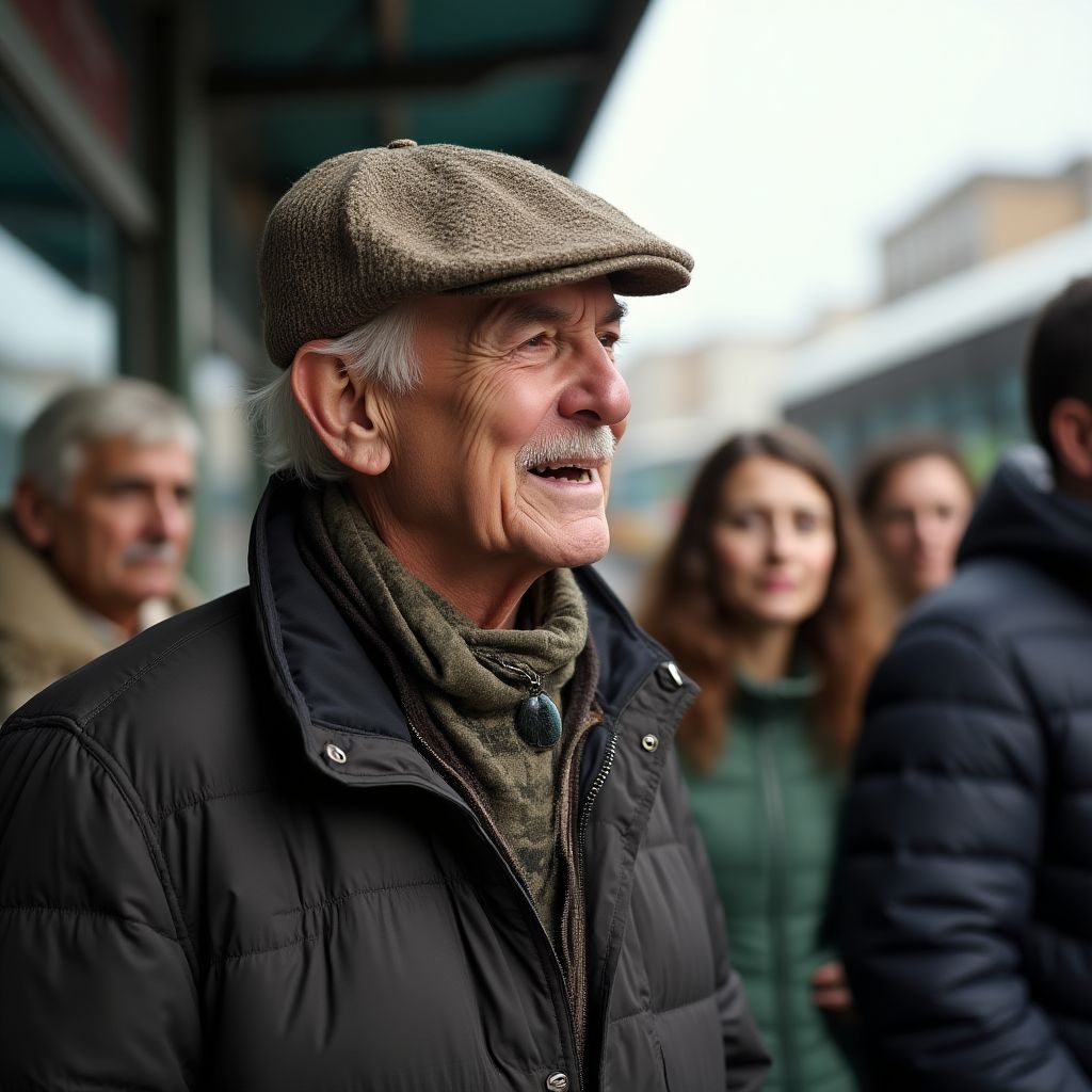 В толпе у остановки выделялся пожилой мужчина лет семидесяти. Его плечи были согнуты под тяжестью видимых лет и невыразительных переживаний, а изношенный плащ скрывал постаревшую, но выразительную фигуру. Усталый взгляд с глубокими морщинами рассказывал о тяжёлой судьбе, а синие глаза — о безграничной доброте, затерявшейся среди житейских бурь. Скрип леопардовой трости напоминал о его борьбе с возрастными недугами, а синие нитки пальцев, не скрываемые перчатками, тихо дрожали от холода и бессилия. Его одежда — неброская, местами потертая и заплатанная — не скрывала принадлежности к низшему социальному классу.