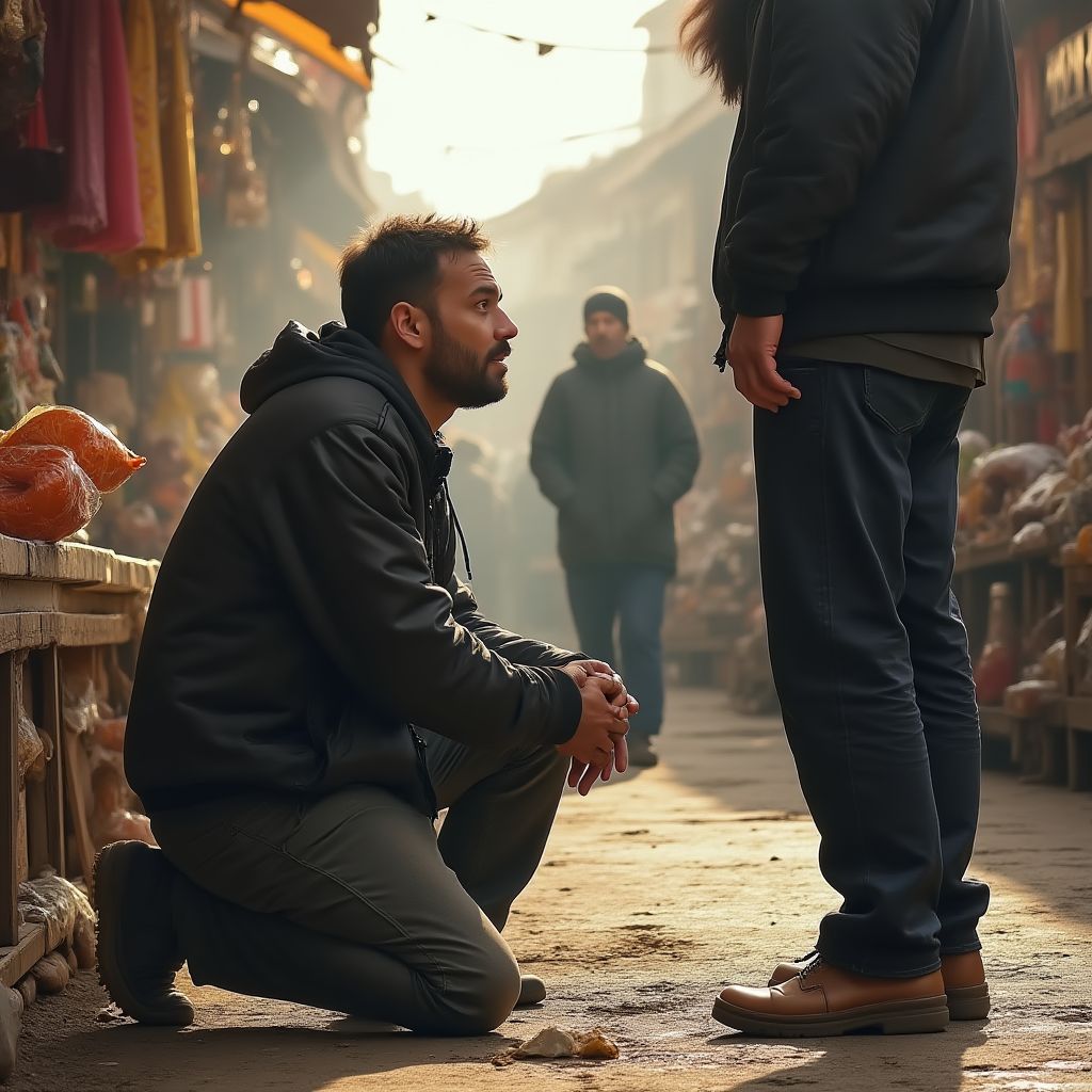 «Что же делать? Отдать или посмотреть? Кто я после всех этих лет — лишь очередной нищий на рынке? Или тот, кто сможет пробудить справедливость? Нужно решиться…» — мысли метались в голове, пронзая сознание словно острые иглы. Вздохнув глубоко, он медленно опустился на колени перед покупателем — это был неожиданный жест, прежде незнакомый ему. На рынке воцарилась гробовая тишина, все взгляды устремились на этого неуловимого момента.