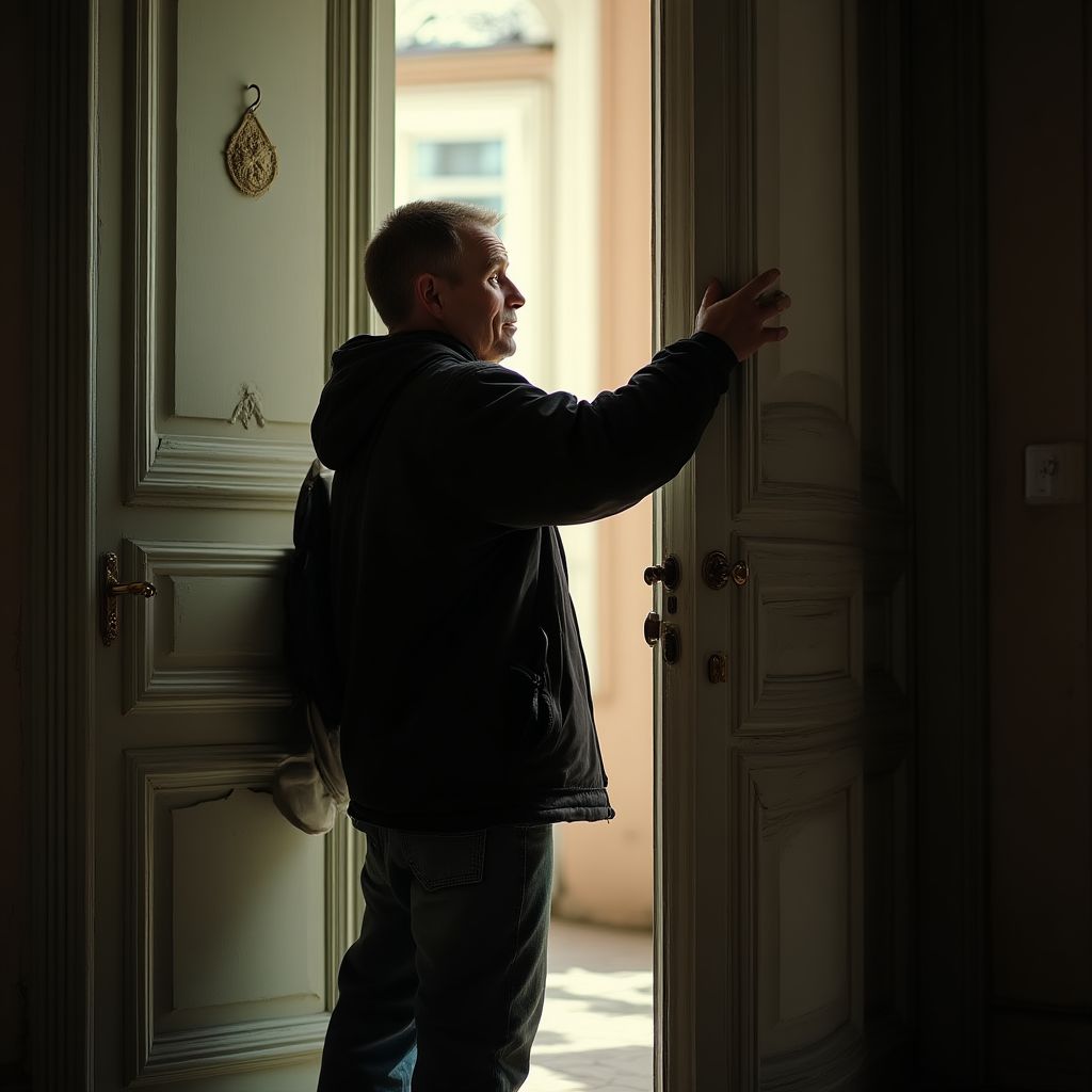 Мальчик Никита, лет двенадцати, с широкой улыбкой и яркими глазами, спрыгнул с лестницы и направился домой после школы. Его одежда была чистой, но с натяжкой — простая футболка и потертые джинсы, указывающие на средний достаток семьи. Его волосы весело взъерошены ветром, а в руке он сжимал небольшой пакет с покупками для мамы. Рядом с домом Никита чувствовал себя уверенно, зная, что в его комнате его ждёт тепло и уют. Но сегодня что-то было иначе — он заметил человека в тени, стоявшего у двери.