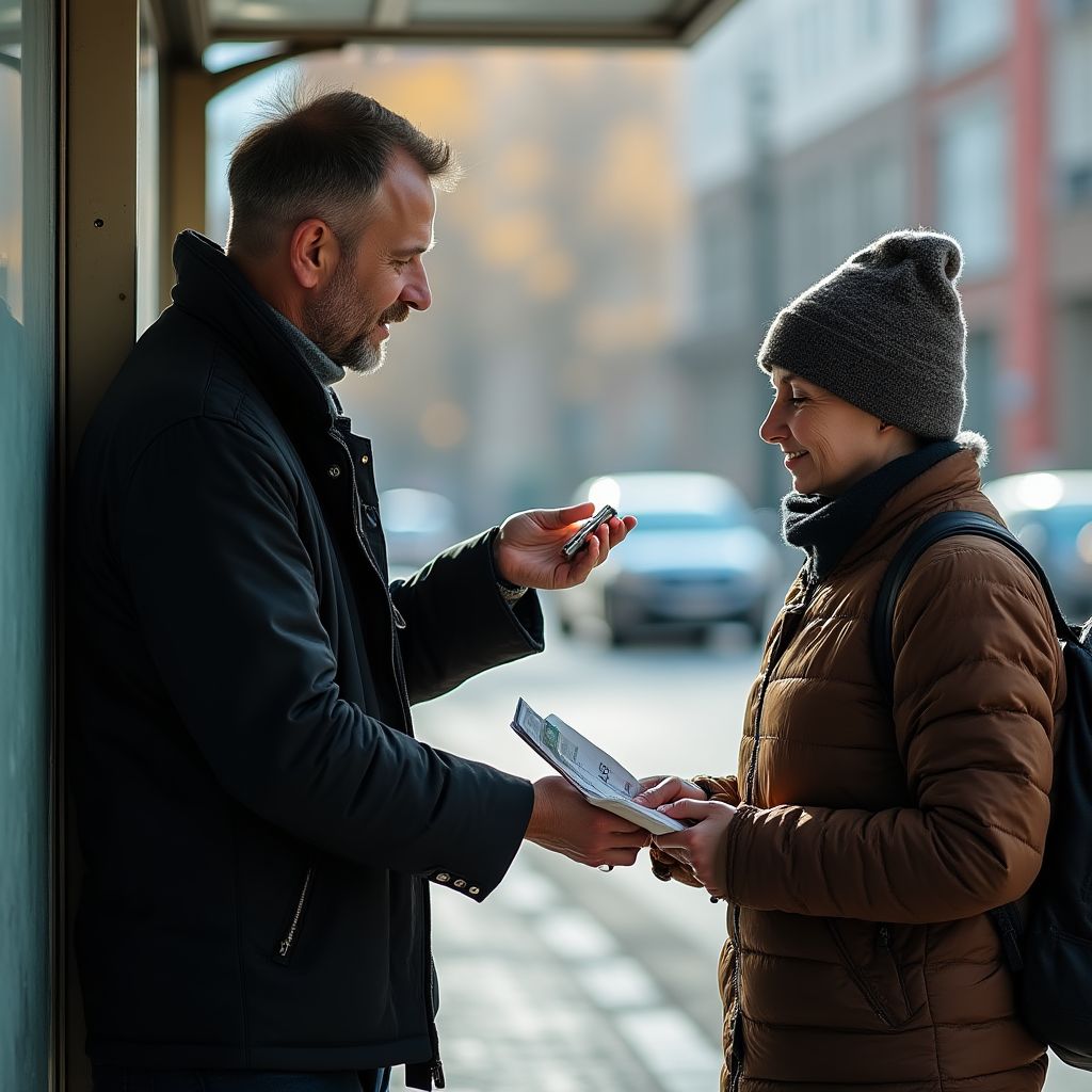 Холодный мартовский вечер сжимал город в ледяные объятия. На заброшенной остановке возле старого рынка суетились редкие прохожие, торопливо укутанные в тяжелые пальто и шарфы. Блеклый свет уличного фонаря слабо освещал смутные силуэты, а ветер обдавал лицо резким запахом морозного воздуха с примесью сырого асфальта и влажной грязи. Где-то вдалеке скрипнули цепи, а на мокром тротуаре отражались размытые огни проезжающих машин — город не спал, но казался уязвимым и хрупким. В этот момент на остановке появился он — мужчина средних лет, с усталым взглядом и засаленными руками, и подошел к дрожащей от холода женщине, укрытой поношенным пальто.