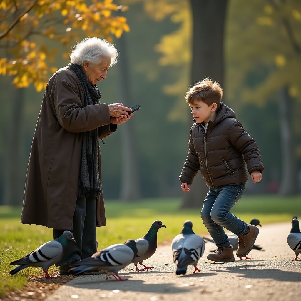 На одной из лавочек сидела пожилая женщина с седыми волосами, аккуратно собранными в пучок. Её руки, покрытые морщинами и шрамами времени, медленно рассыпали крошки хлеба, привлекая голубей, которые щебетали и хлопали крыльями вокруг неё. Её глаза — усталые и добрые — наблюдали за игрой птиц, а тёплый шарф и старомодное пальто выдавали годы скромной жизни. Она казалась частью парка — почти незаметной, но в то же время главной героиней этого мира.