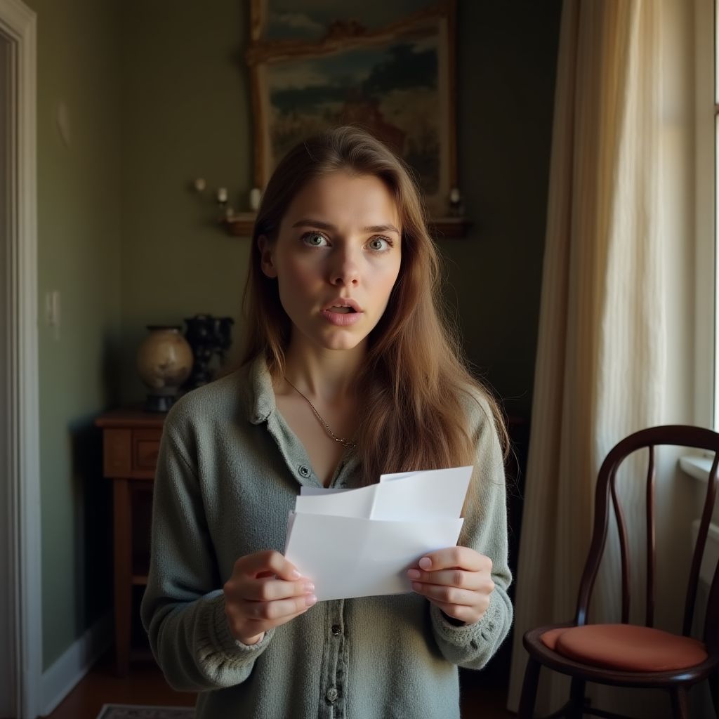 Вдруг в комнату вошла соседка — женщина в поношенном пальто с усталым взглядом. Она нахмурилась, увидев Леру с конвертом. «Что ты там держишь? Это ведь не просто бумажка,» — прошептала соседка, опуская глаза. Лена кивнула и, почувствовав на себе оценивающий взгляд, тихо ответила: «Это письмо бабушки… что-то очень важное.»