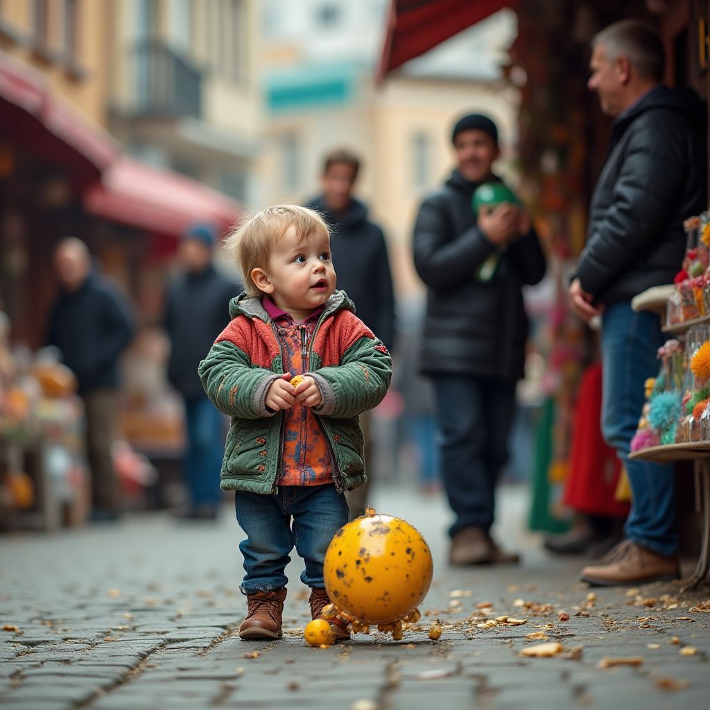Маленький мальчик лет пяти — худенький, в потрёпанной куртке и слишком больших ботинках — робко держал в руках любимую игрушку — яркую деревянную машинку с выцветшими красками. Его светло-голубые глаза, полные любопытства и немного усталости, внимательно следили за толпой, словно стараясь не потеряться среди громких криков торговцев и выкриков покупателей. Волосы, спутанные ветром, прилипали к лбу, а кожа была слегка грязноватой, выдавая его бедность.
