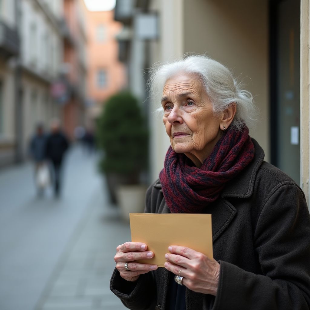 Мария, старушка с седеющими волосами, собранными в тугой пучок, одета была в изношенный тёмно-синий платок и потёртое зимнее пальто, которое явно вышло из моды много лет назад. Её глаза – глубокие, усталые, но светящиеся тихой решимостью, было видно, что жизненные тяготы оставили на лице неизгладимый отпечаток. Ростом она была невысокая, с лёгкой сутулостью, и каждое движение её выдавало усталость и болезненный опыт прожитых лет. В руке она крепко сжимала чуть поникший конверт, словно это была последняя ниточка надежды.