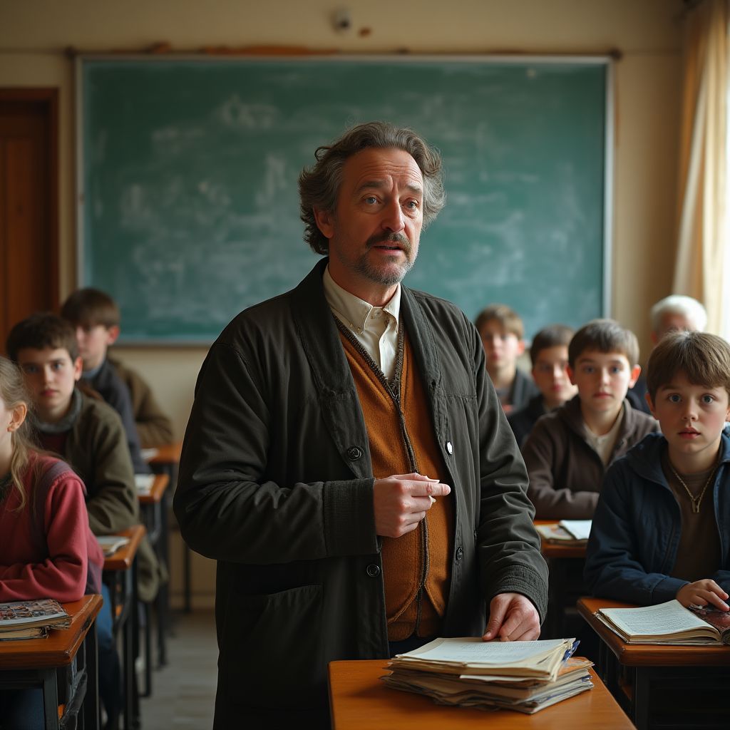 Дверь с громким хлопком захлопнулась, и толпа в классе словно замерла в ожидании. Учитель в старом пальто, с дрожащими руками, положил книгу на стол и, глубоко вздохнув, произнёс: «Я не просто ваш учитель. Меня зовут Александр, и эта одежда — след моего прошлого, о котором вы не подозреваете.» Сердце бьётся так громко, что кажется, его слышат все. Свет фонаря просачивается сквозь пыльные окна, отбрасывая на стены тени в форме призраков забытого времени.